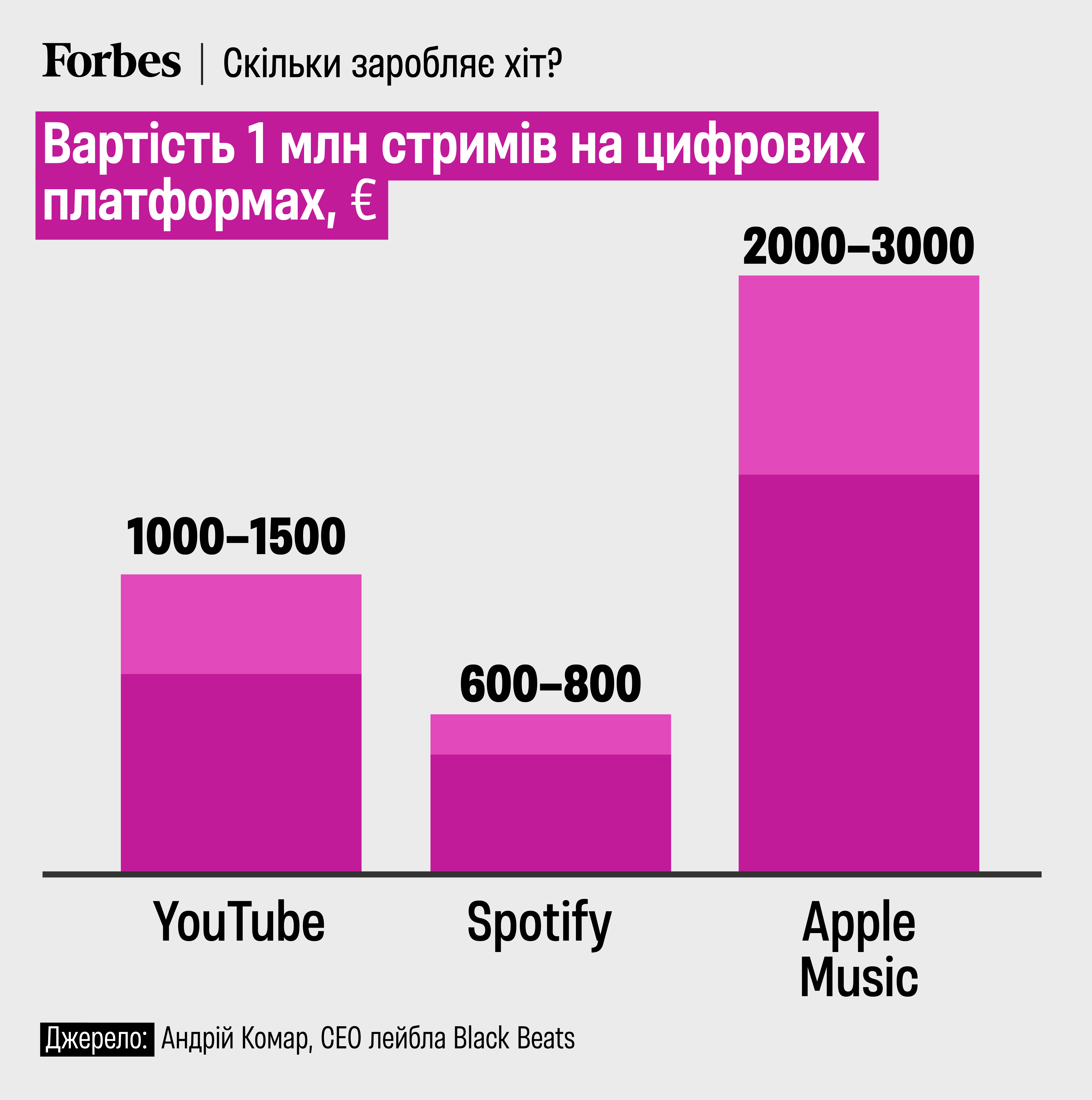 «Модель монетизації на стримінгах єдина для всіх, – каже засновниця та СЕО лейблу pomitni Ірина Горова. – Виплати залежать від кількості прослуховувань, країни слухача та конкретної платформи». На IV квартал 2024 року вартість 1 млн стримів на YouTube коливалася від €1000 до €1500, тарифи Apple Music були в межах €2000–3000, а Spotify – від €600 до €800, додає СЕО лейблу Black Beats Андрій Комар.