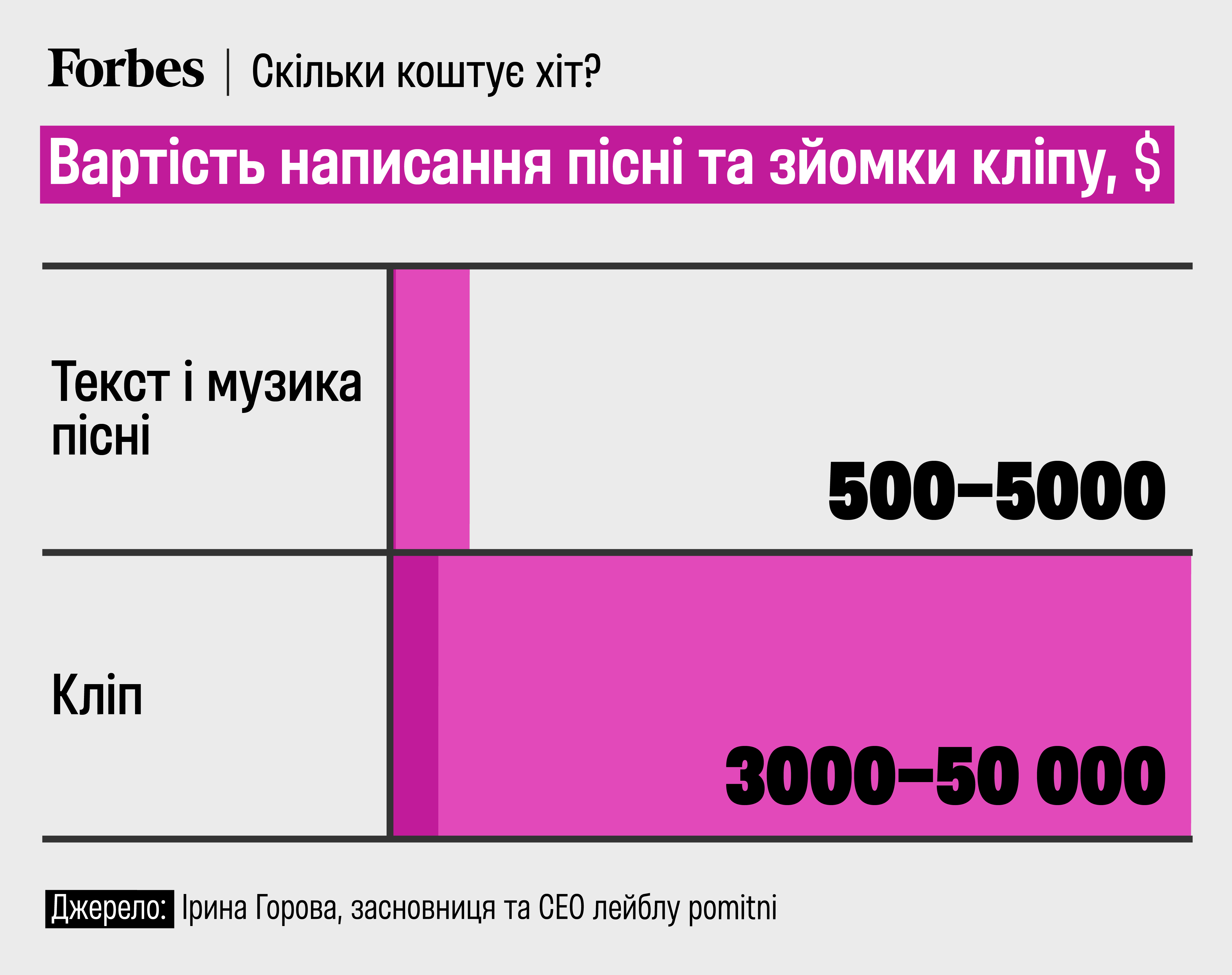 Для молодих артистів зйомка кліпу може стартувати від $3000, для виконавців вищого рангу ця цифра може збільшуватися й до $50 000, каже Горова. Музиканти pomitni працюють і з початківцями, і з відомими режисерами – Інді Хайтом, Таню Муїньо, Русланом Маховим, Аланом Бадоєвим, перераховує Горова. На рахунку Хайта, Махова та Муїньо – кліпи для Dorofeeva, Monatik, Tvorchi.