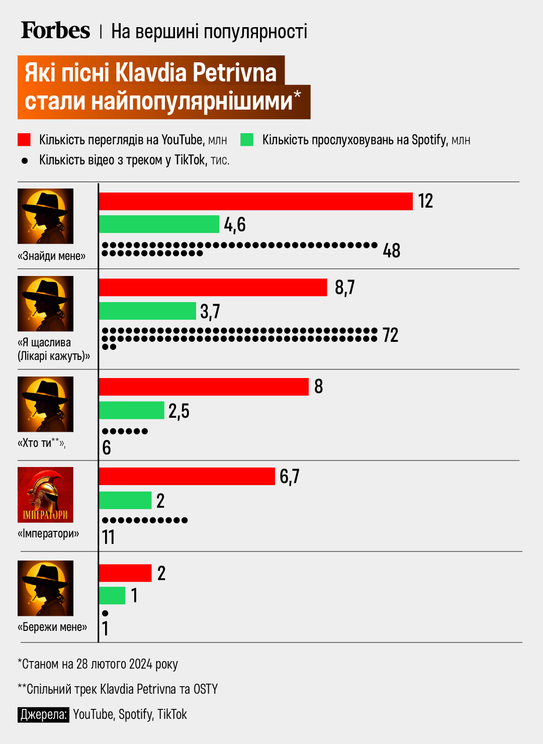 «Колись одразу п’ять треків Клавдії потрапили в топ-10 [Apple Music], – говорить Шевченко. – Можливо, одного разу в першій десятці усі треки будуть її».