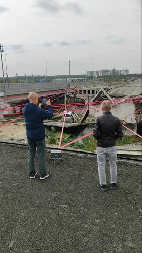 Далі гід показує клієнту на планшеті, який вигляд у перші дні після звільнення мали вулиці містечок Київщини, де були російські війська. І показує дорогою, які вони зараз. Розповідає, де стояли російські танки та звідки стріляли по мирних мешканцях. Привозить і до підірваного мосту через річку Ірпінь, і до цвинтаря автівок.