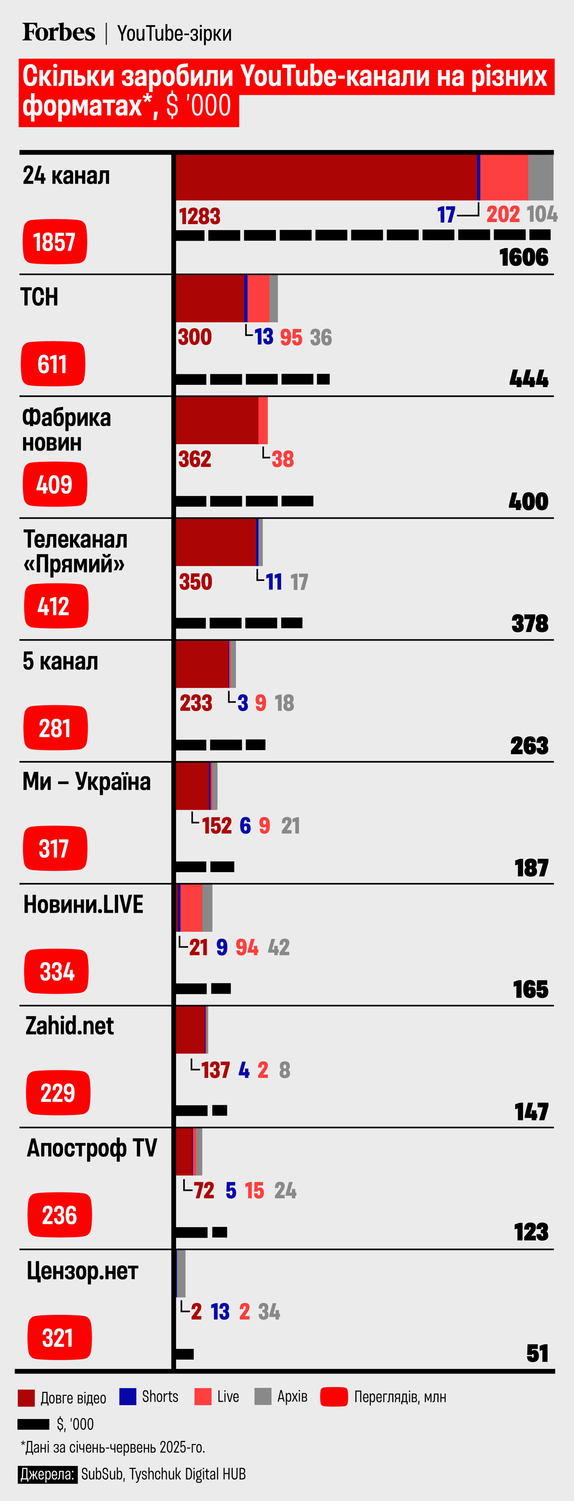 У деяких каналів показники вищі. Наприклад, на довгих відео «24 канал» отримує $1,08 за 1000 переглядів, «5 канал» – $1,27, а на прямих ефірах ТСН отримує $2,2, за даними Тищук. Зеленов із «24 канал» підтверджує порядок цифр. Інші канали відмовились підтвердити дані або не відреагували на запити.