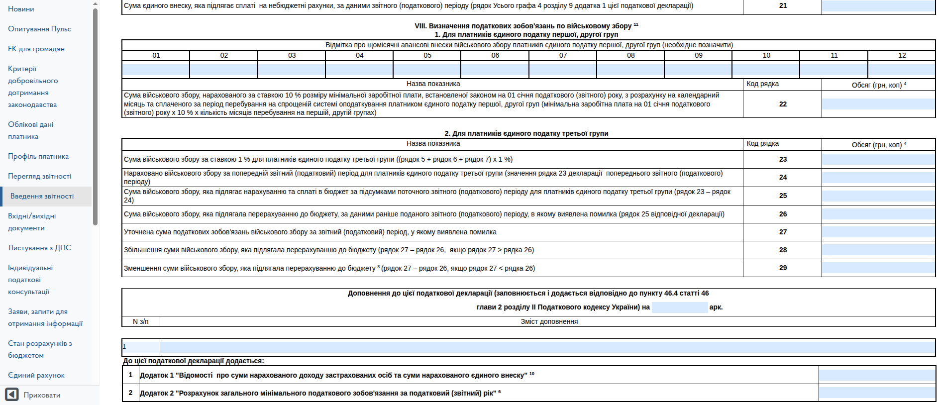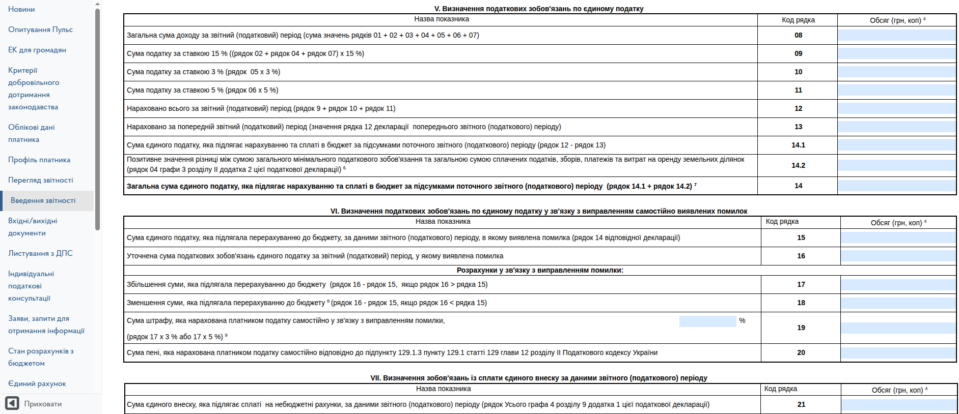 - У ФОП третьої групи при звітуванні за півріччя, три квартали і рік потрібно вказувати весь дохід з 1 січня звітного року, навіть якщо за попередні квартали вже подані декларації та сплачені податки. Загальна сума вписується в розділі IV, а в рядку 13 – нарахований єдиний податок за періоди, за який ви вже прозвітували і сплатили податки. Форма автоматично вирахує, скільки коштів (Єдиний податок (рядок 14) та військовий збір (рядок 25)) ви маєте відрахувати до бюджету.