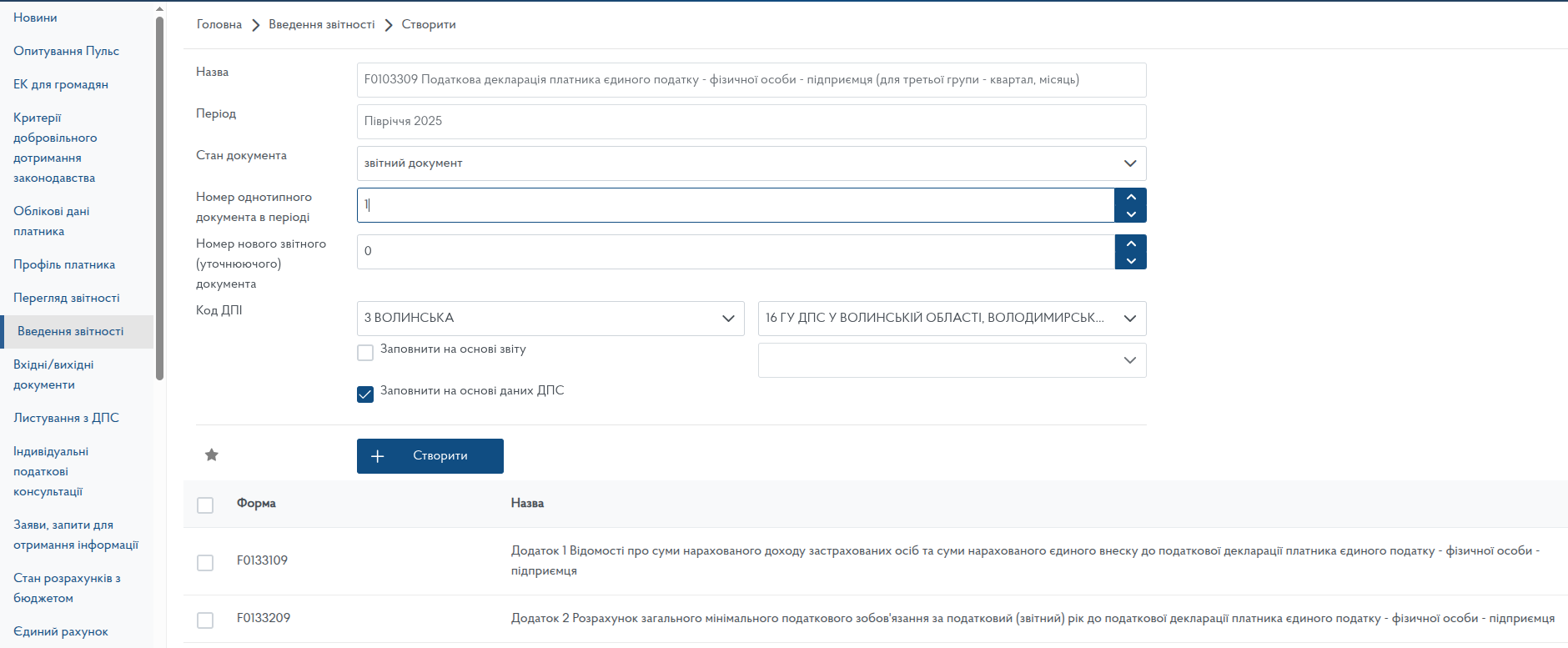 При поданні звітності в електронному кабінеті потрібно авторизуватись електронним ключем (Кваліфікований електронний підпис або КΕΠ – це електронний ключ, який ідентифікує вашу особу. Він дозволяє підписувати документи дистанційно, користуватися е-послугами та реєструватися на державних порталах) або через «Дія.Підпис». У розділі «Ведення звітності» (восьмий рядок у колонці ліворуч в кабінеті) потрібно обрати рік і період (У випадку онлайн-бізнесу, ФОПи другої групи обирають відповідний місяць, а третьої групи – один квартал, півріччя, дев’ять місяців або рік), за який потрібно подати декларацію, після чого натиснути кнопку «Створити» в тому самому рядку. Обравши відповідну форму (Для ФОП, станом на серпень 2025 року – F0103309 Податкова декларація платника єдиного податку фізичної особи-підприємця (для третьої групи -квартал, місяць)) і стан документа («Звітний документ» -декларація подана вперше до закінчення крайнього терміну звітності. «Звітний новий документ» -обирається, якщо термін звітності ще не закінчився, але потрібно подати виправлену декларацію. «Звітний уточнюючий документ» обирається для подання виправленої декларації за період, якщо крайній термін подання вже минув) і натисніть клавішу «Створити» знизу та перейдіть до заповнення бланку.