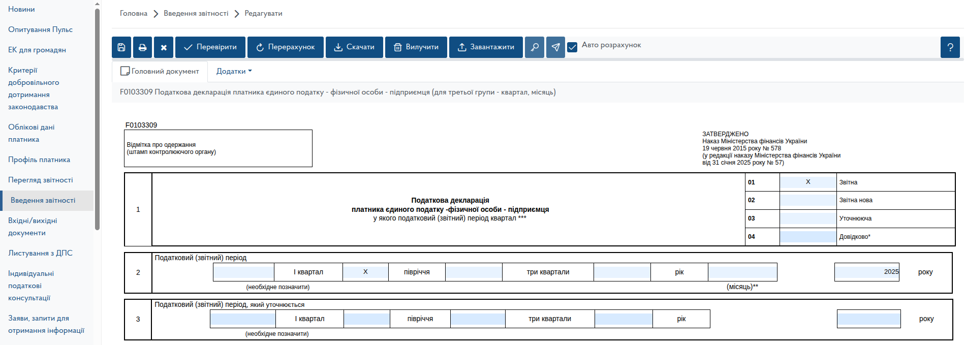 Після заповнення бланку в меню вгорі його можна перевірити, підписати і надіслати до податкової.