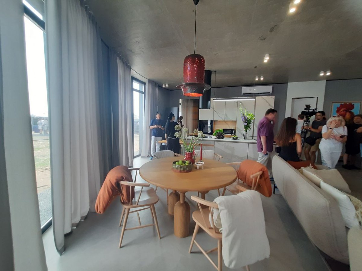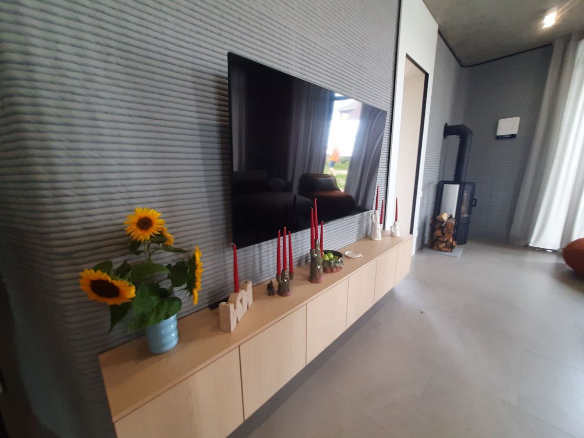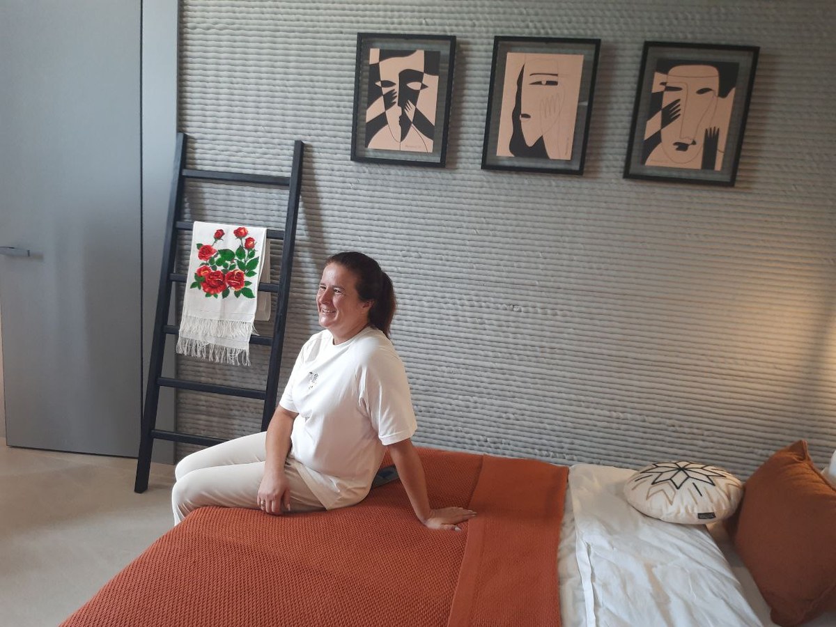 Також у вітальні-кухні 3D-будинку розташовані вікна в підлогу, максимально панорамні із затишними шторами, якщо господарі захочуть більшої приватності. Над інтерʼєром працювала дизайнерка. Пані Наталя каже, що в них з доньками питали побажання щодо оздоблення, але, за її словами, результат перевершив всі очікування. На питання, які в неї враження від будинку, господиня ніяковіє і вимовляє: «Вау». Каже, що досі не може звикнути.
