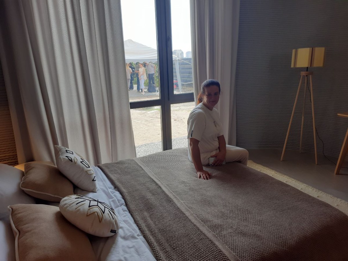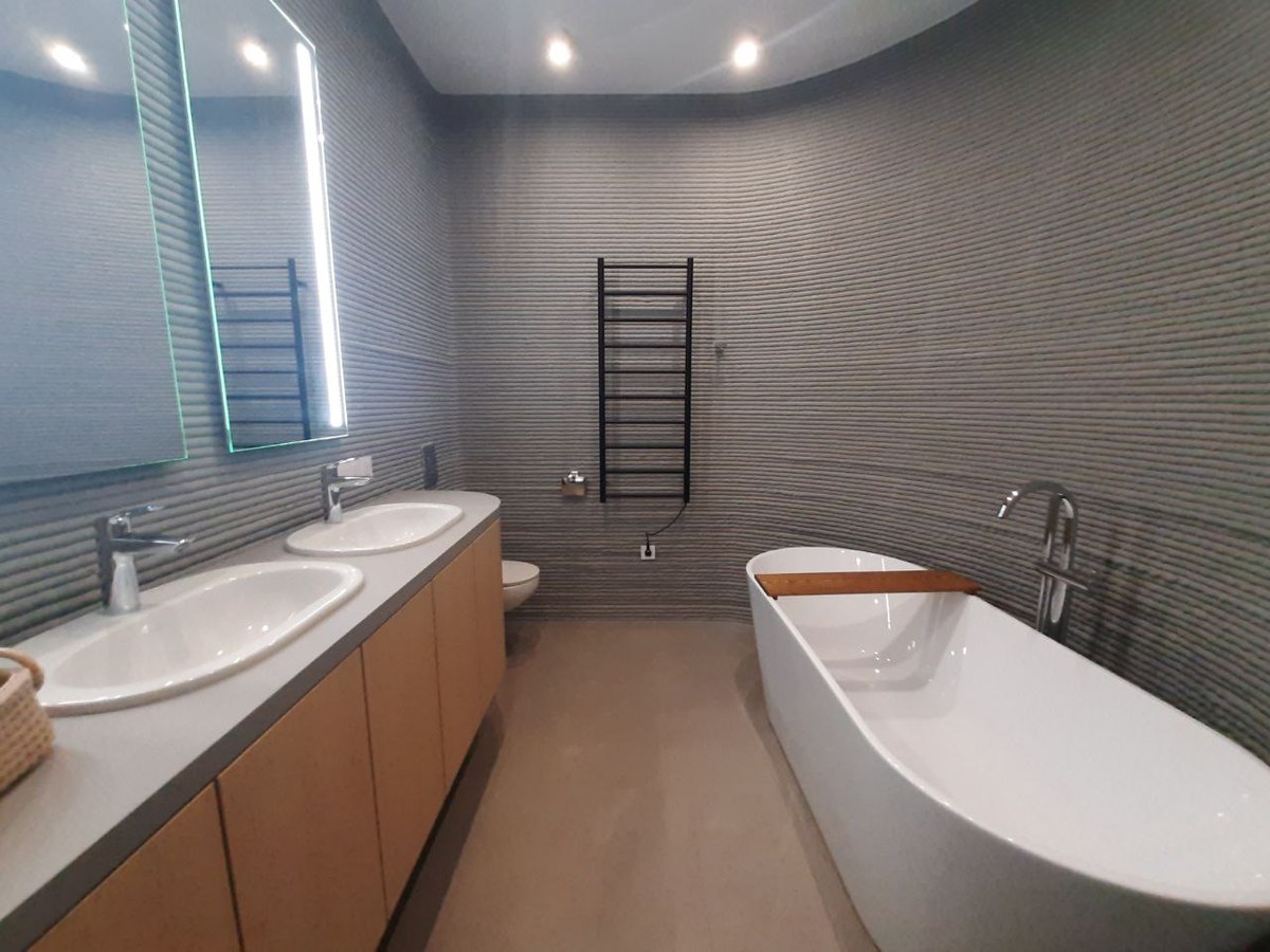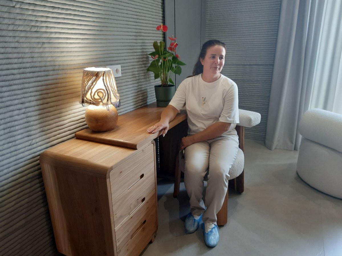 Також у вітальні-кухні 3D-будинку розташовані вікна в підлогу, максимально панорамні із затишними шторами, якщо господарі захочуть більшої приватності. Над інтерʼєром працювала дизайнерка. Пані Наталя каже, що в них з доньками питали побажання щодо оздоблення, але, за її словами, результат перевершив всі очікування. На питання, які в неї враження від будинку, господиня ніяковіє і вимовляє: «Вау». Каже, що досі не може звикнути.