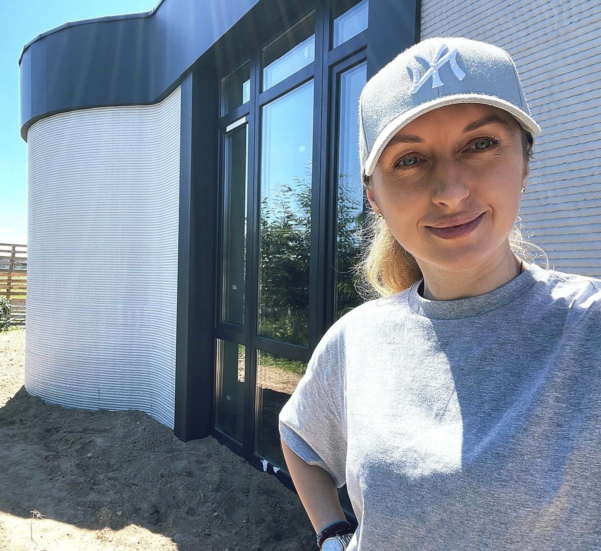 Наталя Березова разом з двома доньками та онуком, який народився всього кілька днів тому, з 18 липня стали власниками першого в Україні будинку у с. Михайлівка-Рубежівка Ірпінського району, який надрукували на 3D-принтері.