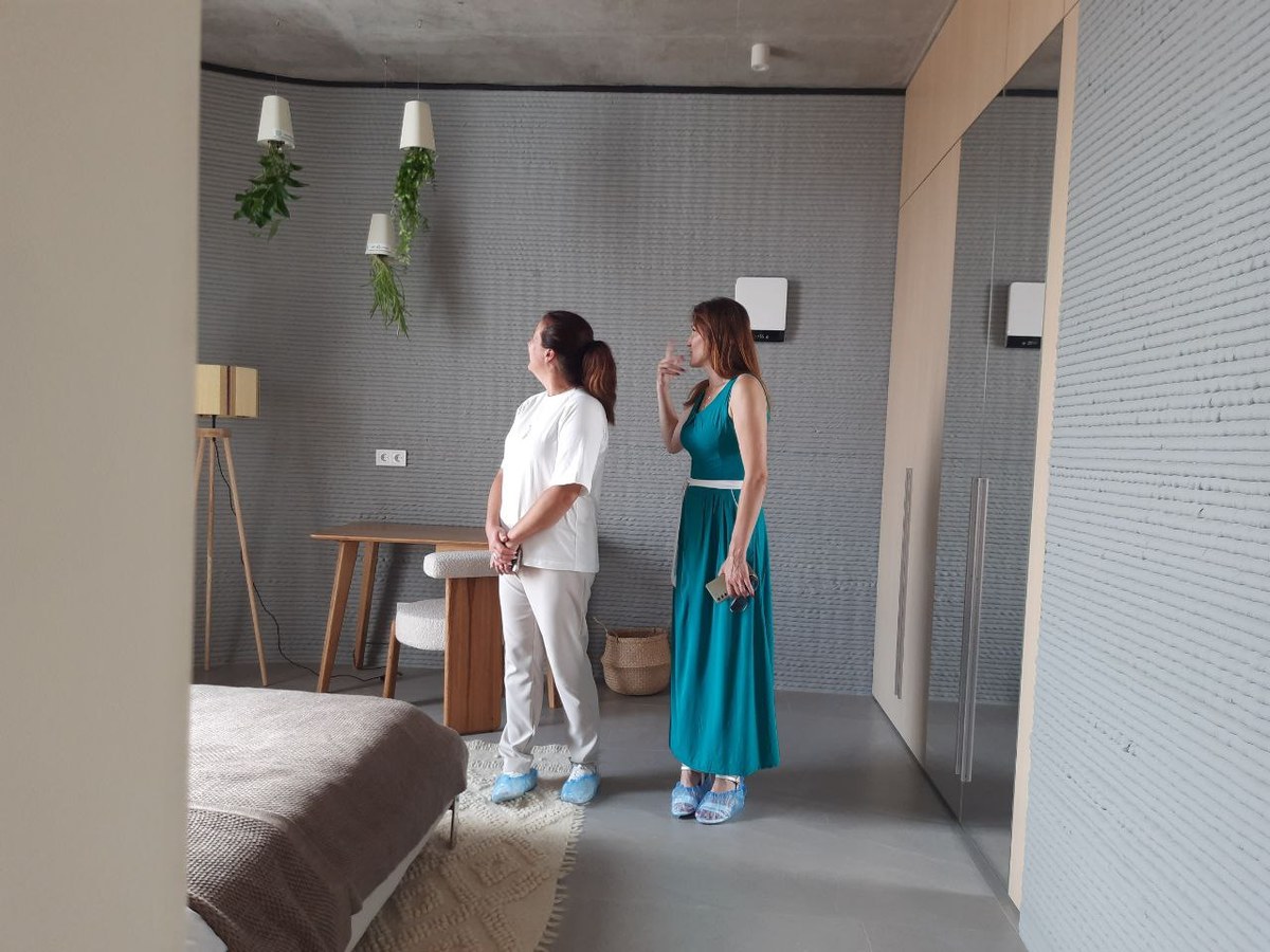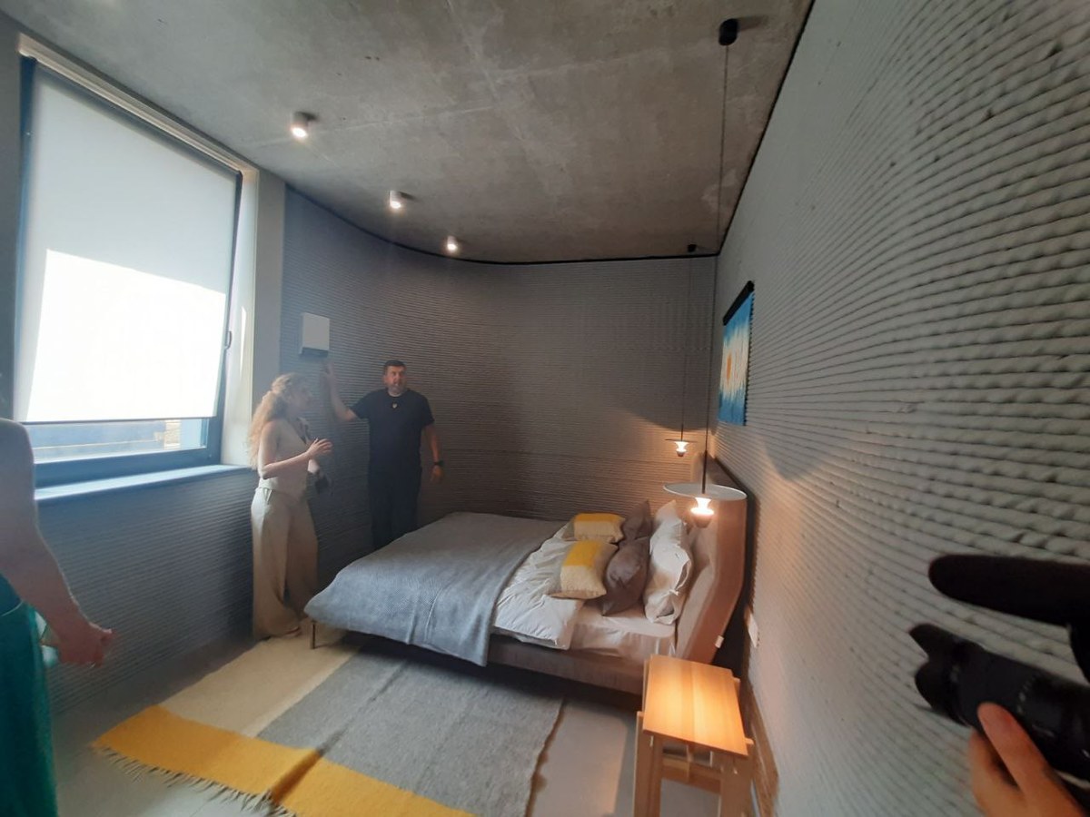 За технології друку будинку, між шарами цементно-піщаної суміші розташовані порожнини. Як повідомила Інна Фурман, в одну з них вкладається утеплювач, в іншу — встановлюється ребро жорсткості і закладаються мережі. Отже, у безпековій кімнаті друга порожнина заповнена монолітним бетоном. В кімнату навіть не проходить мобільний звʼязок. А вікно, яке розташоване на одній зі стін, також особливе. Інна повідомила, що вікно має унікальну систему монтажу, а також бронь-скло та унікальні кріплення самого вікна.
