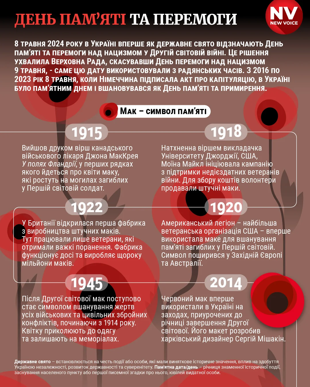 8 травня Україна вперше відзначає День памʼяті та перемоги над нацизмом у Другій світовій війні 1939−1945 років — як єдине державне свято замість двох різних знакових дат. Натомість 9 травня як День перемоги в Україні відтепер скасовано.
