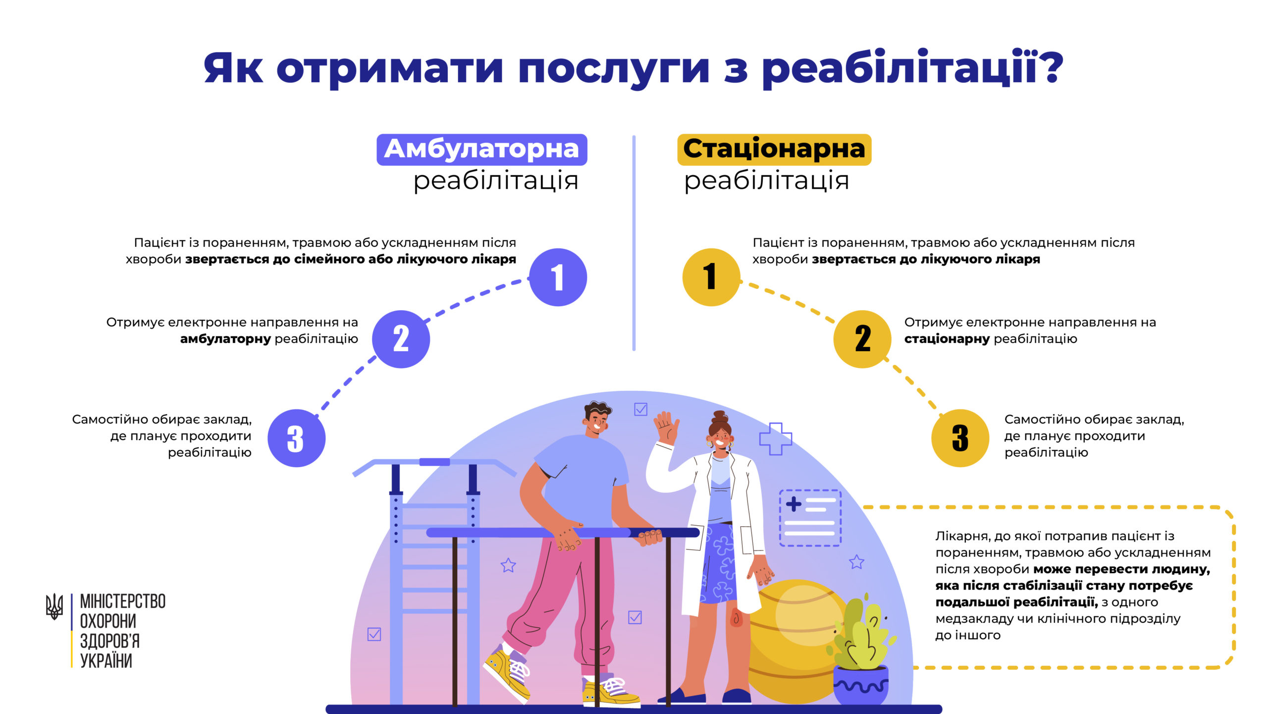 Щоб пройти безкоштовну реабілітацію, потрібно отримати направлення від сімейного лікаря (або терапевта чи педіатра) чи профільного лікаря вториинної ланки, який/яка веде пацієнта, а також обрати медичний заклад. У лікарні для огляду пацієнта/-ки створюють мультидисциплінарну реабілітаційну команду, до якої належать лікарі реабілітаційної медицини, ерготерапевти, протезисти, психологи, медсестри з реабілітації тощо. Ці фахівці обстежують постраждалих і встановлюють діагноз. Потім укладають та узгоджують індивідуальний реабілітаційний план і програму терапії.