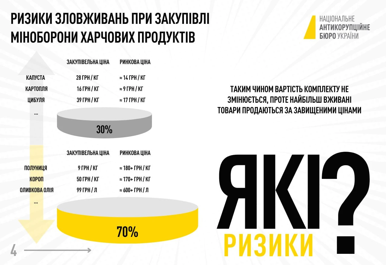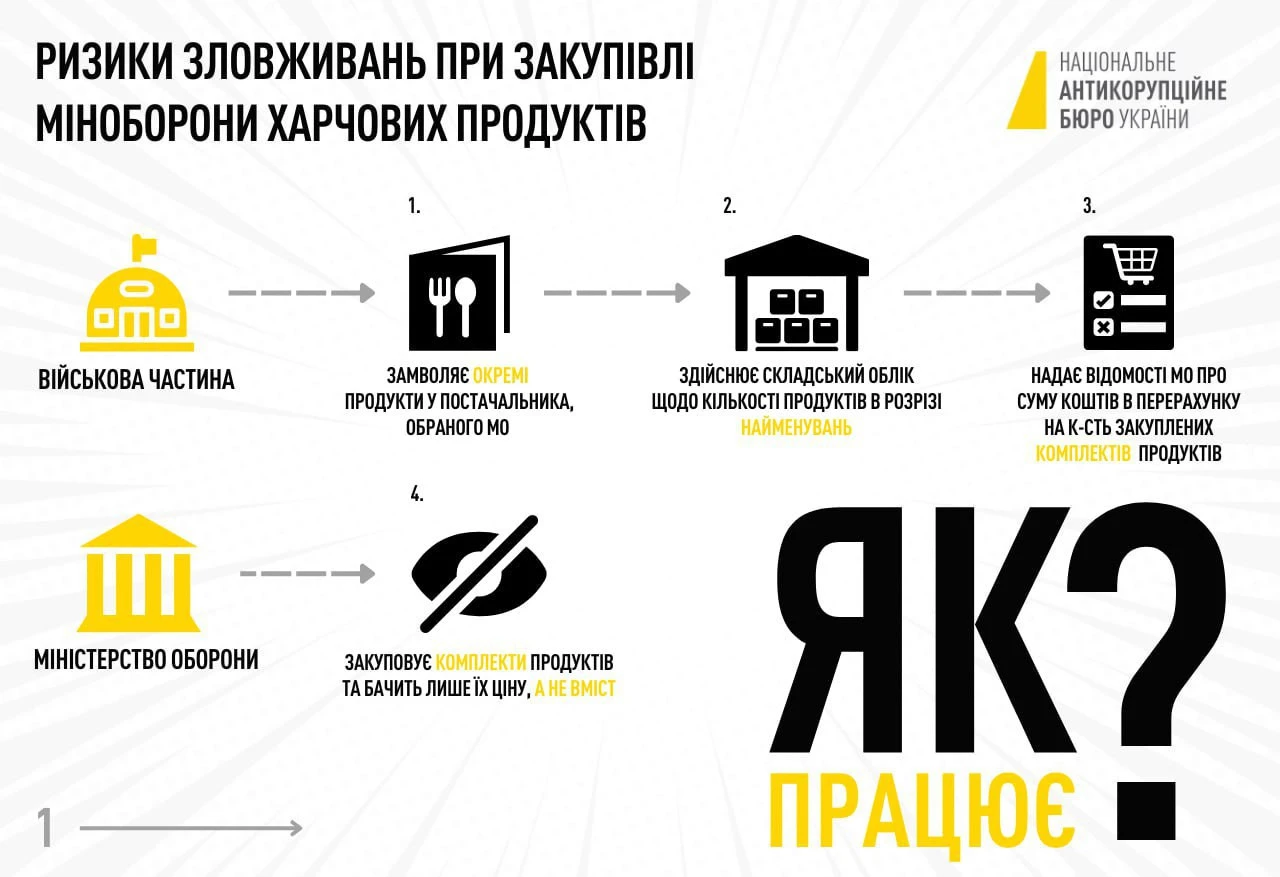 Детективи Національного антикорупційного бюро в межах розслідування кримінального провадження щодо закупівлі Міністерством оборони послуги з організації харчування підтвердили існування корупційної схеми, яка дозволяє значно завищувати ціни на певні категорії продуктів