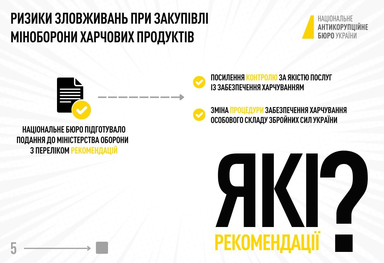 Окрім того, в НАБУ повідомили, що виявили передумови корупційних зловживань. Для їх усунення Нацбюро сформувало відповідні рекомендації та передало їх на розгляд Міноборони. Зокрема, вони передбачають посилення контролю за якістю послуг із забезпечення харчуванням, а також внесення змін до нормативно-правових актів, що регулюють процедуру забезпечення харчування особового складу Збройних Сил України.