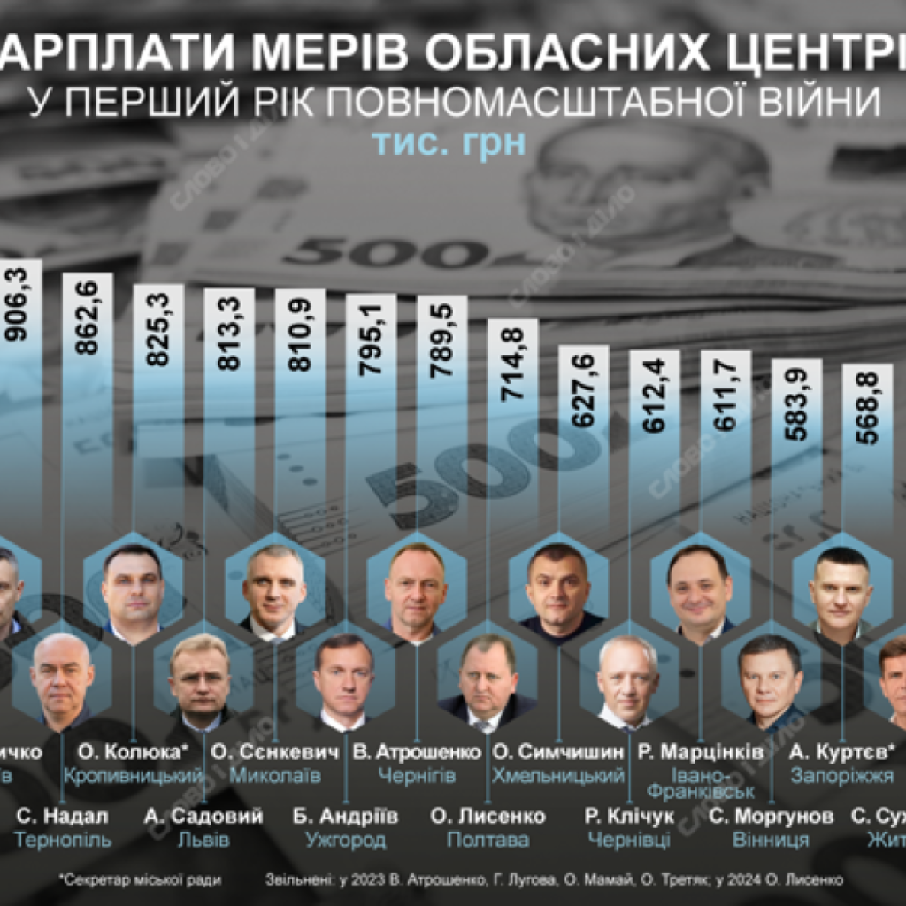 Мер Полтави Олександр Лисенко задекларував за 2022 рік 714,8 тисячі гривень зарплати (2021 – 697,5 тисяч), мер Хмельницького Олександр Симчишин – 627,6 тисячі гривень (2021 рік – 910,5 тисяч), мер Чернівців Роман Клічук – 612,4 тисячі гривень (2021 рік – 634,9 тисячі), мер Івано-Франківська Руслан Марцінків – 611,7 тисячі гривень (2021 рік – 572 тисячі), мер Вінниці Сергій Моргунов – 583,9 тисячі гривень (2021 – 608,3 тисячі), секретар міськради Запоріжжя Анатолій Куртєв – 568,8 тисячі гривень (2021 рік – 415,7 тисячі), мер Житомира Сергій Сухомлин – 522,5 тисячі гривень (2021 рік – 362,6 тисячі), мер Рівного Олександр Третяк – 489,3 тисячі гривень (2021 рік – 893,7 тисячі), мер Полтави Олександр Мамай – 351,9 тисячі гривень (2021 рік – 656,4 тисячі).