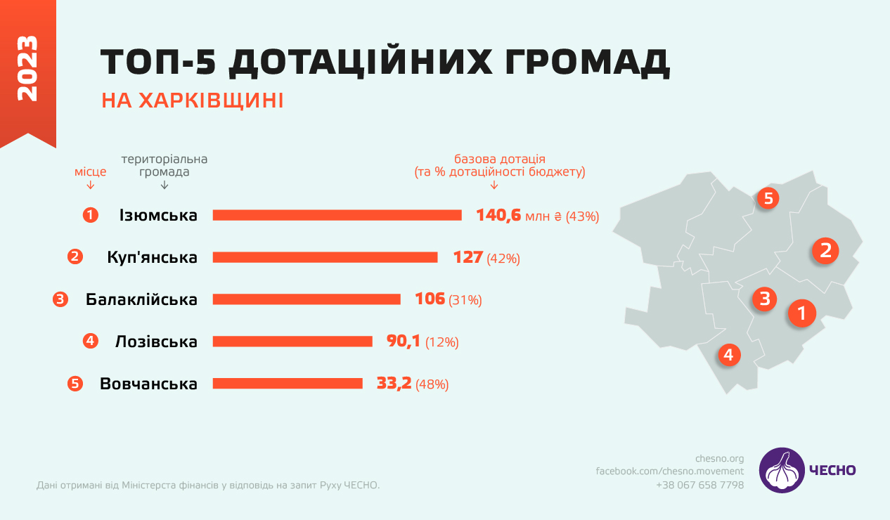 Найбільше базових дотацій отримали деокуповані Ізюмська, Куп’янська, Балаклійська та Вовчанська громади, які зазнали критичних руйнувань, а також прифронтова Лозівська. На них припадає чверть базових дотацій Харківщини.