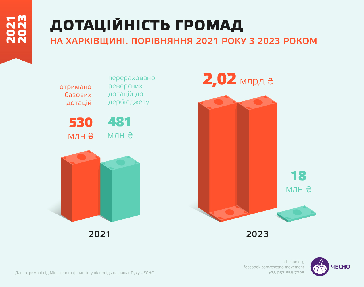 У 2023 році понад 90% громад Харківщини отримали базові дотації. Загальний обсяг базових дотацій громад збільшився в чотири рази порівняно з 2021 роком. Реверсні дотації зменшилися з 481 млн до 18 млн. Харківщина стала одним із п’яти регіонів, які сплатили до держбюджету найменше реверсних дотацій.