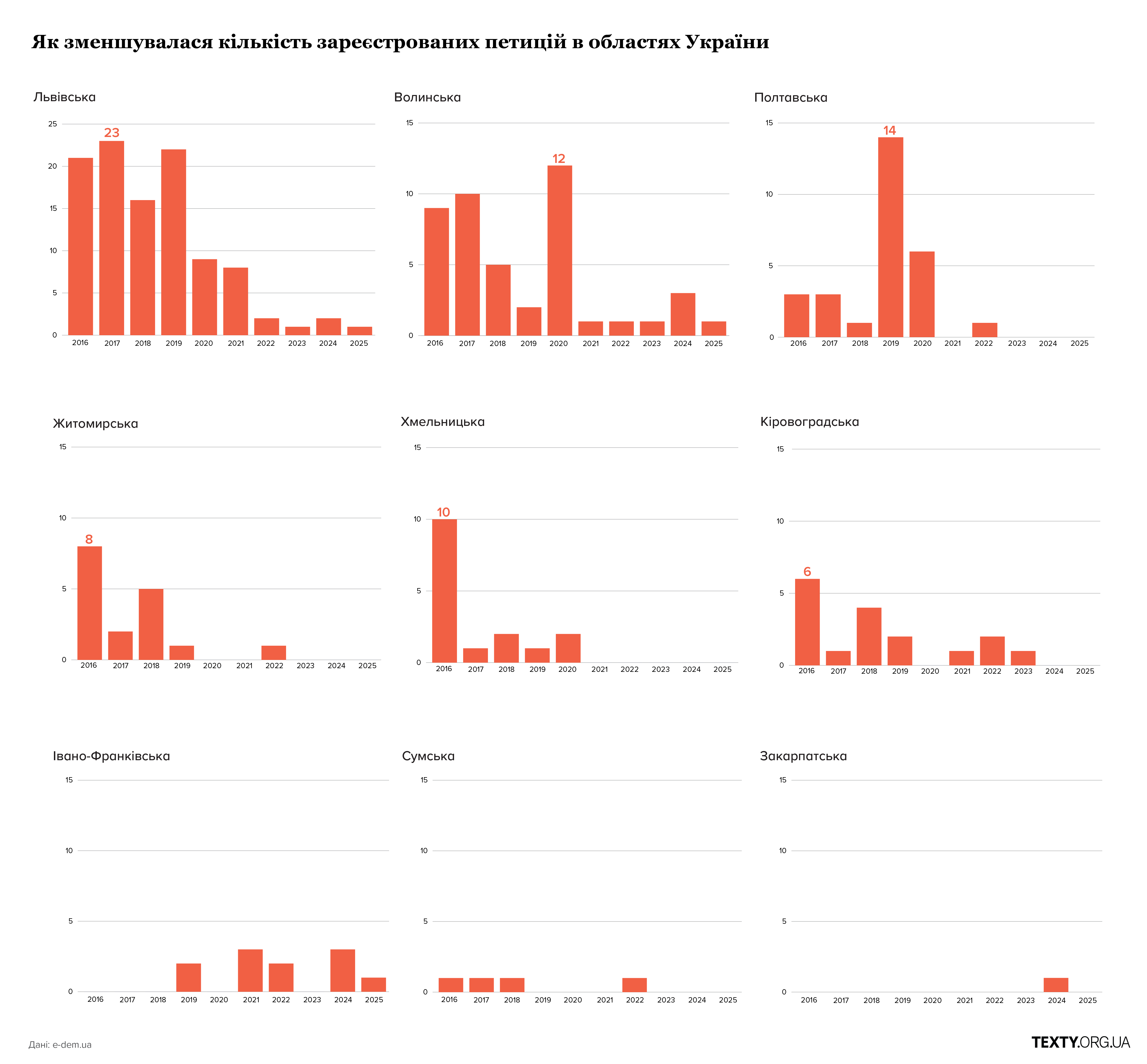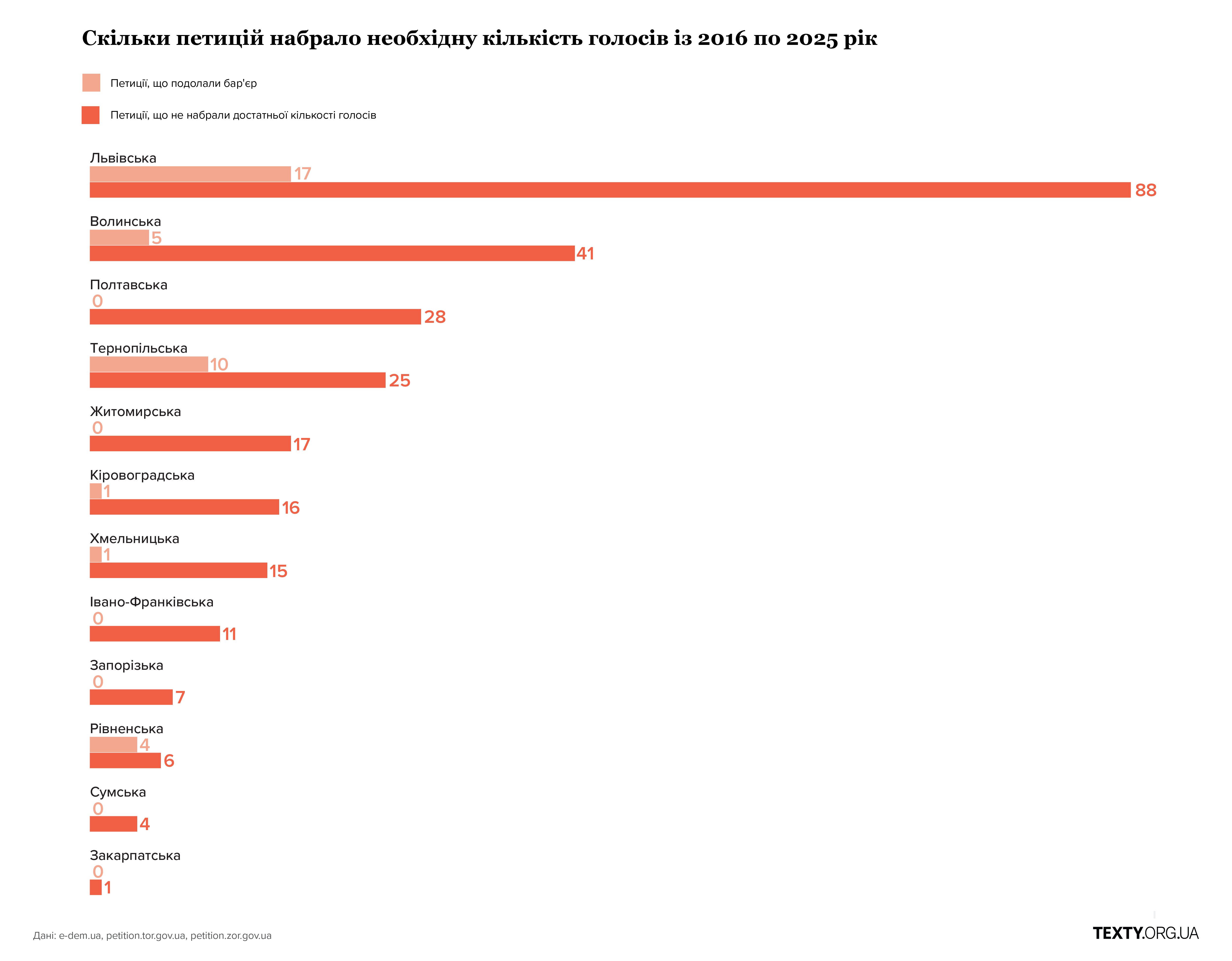 Зі 105 петицій, поданих на Львівщині за весь час, необхідну кількість голосів набрали 17, ще 88 не подолали поріг. На Тернопільщині пройшли 10 петицій, ще 25 залишилися «за бортом». На Волині підтримку дістали 5 із 46. Але в багатьох областях — Рівненській, Запорізькій, Полтавській, Сумській та інших — петиції так і не назбирали голосів. Так само як і на Івано-Франківщині, про кейс якої ми докладно розповімо нижче.