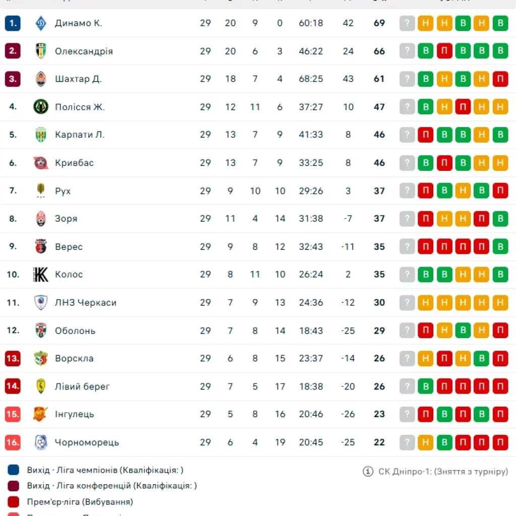 Турнірна таблиця УПЛ після 29 туру