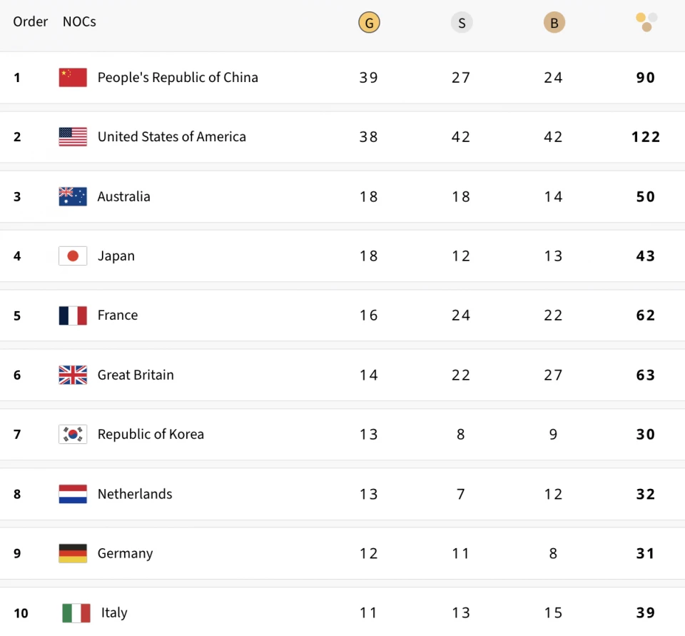 Після 15 змагальних днів Олімпійських ігор у Парижі лідерство в загальному медальному заліку захопив Китай: 39 золотих, 27 срібних і 24 бронзових медалей.