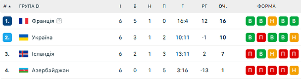 Збірна України (10 очок) фінішувала на другому місці у своїй групі відбору на ЧС-2026, обійшовши Ісландію (7 пунктів), яка посіла третю позицію. Франція (16 балів) з першого місця вийшла на Мундіаль. Замкнув квартет Азербайджан (1 очко).