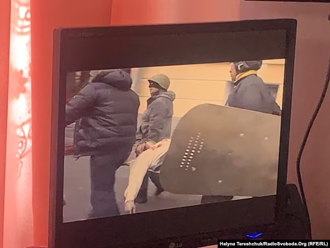 На відео зафіксовано, як беркутівець, який стоїть на КАМАЗі, робить постріл. Поранення було миттєве, в голову, несумісне з життям. За КАМАЗАми на блоках стояли три беркутівці і середній зробив постріл в сина.