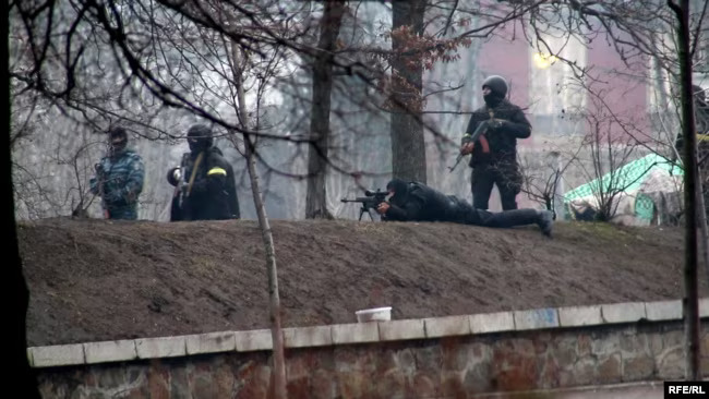 Спецпризначенці з автоматом Калашникова і снайперською гвинтівкою використовують вогнепальну зброю проти протестувальників, Київ, вулиця Інститутська, 20 лютого 2014 року