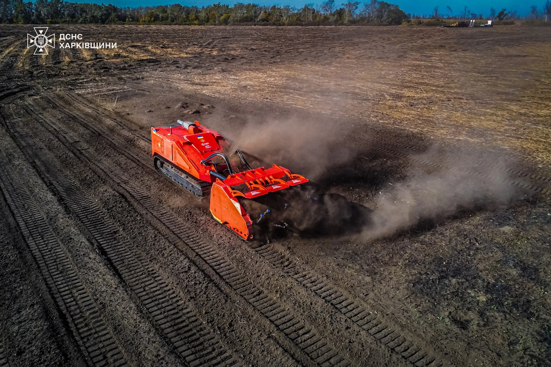 Механізований комплекс для гуманітарного розмінування DOK-ING MV-10 під час роботи українських саперів. Фото: пресцентр ДСНС України у Харківській області