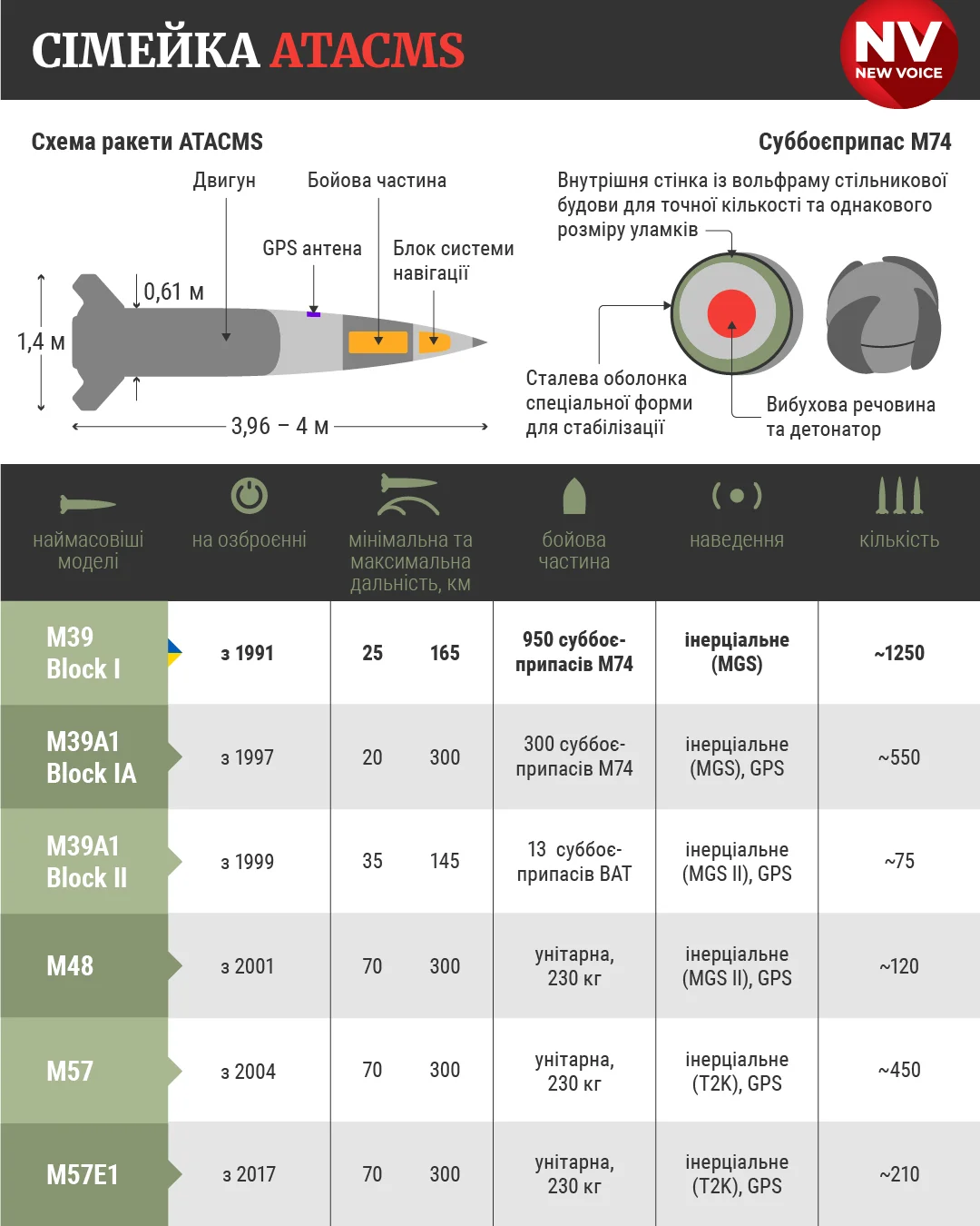 Восени 2023 року Україна отримала невелику кількість ракет ATACMS меншої дальності з касетною боєголовкою. Тоді йшлося про ракети MGM-140A (вони ж M39 або ATACMS Block I) з максимальною дальністю ураження до 165 км.