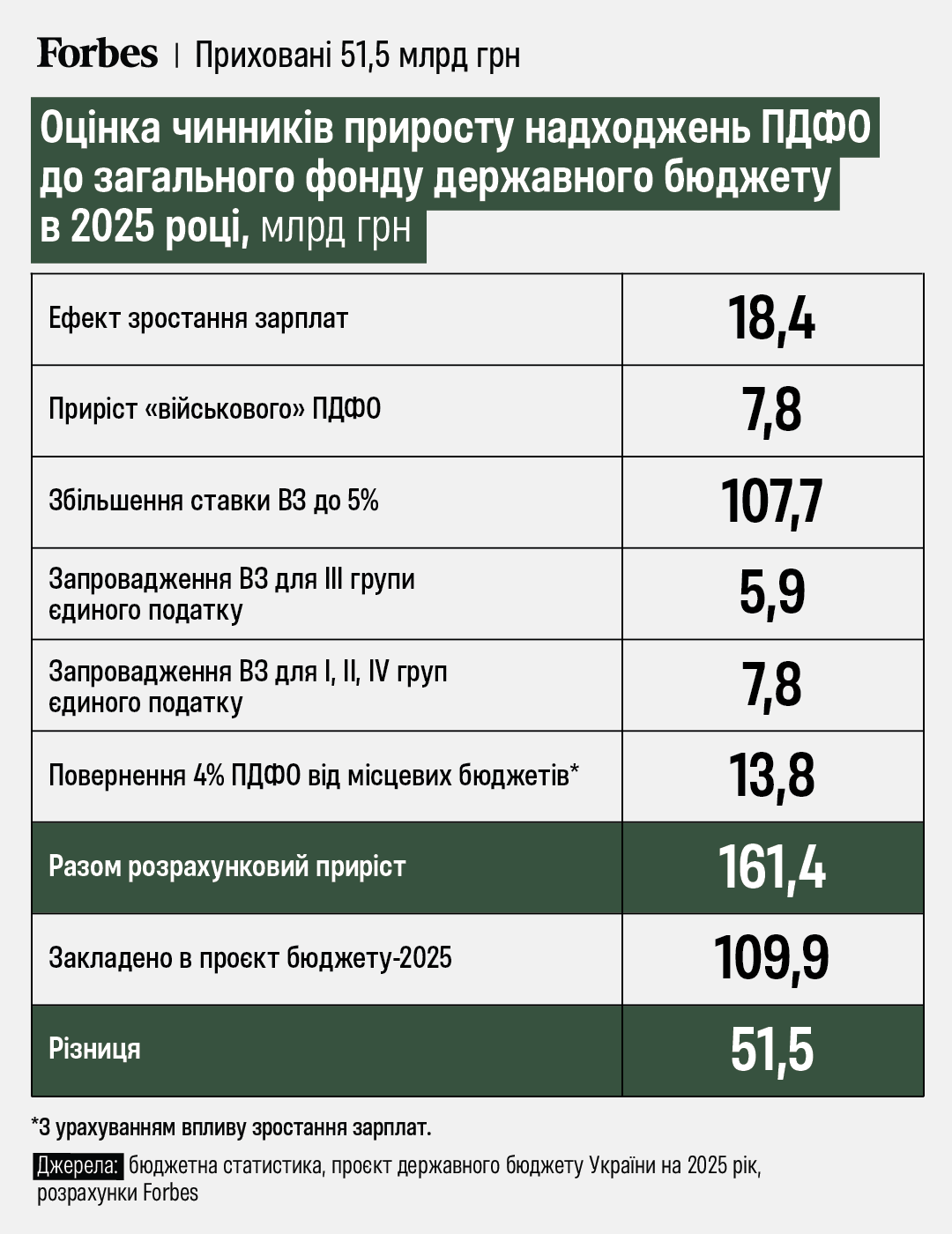 До цього слід додати заплановане урядом перенаправлення 4% зібраного ПДФО із бюджетів територіальних громад (крім м. Києва) до державного бюджету. З урахуванням очікуваного урядом зростання зарплат на 18,5%, йдеться про додатковий ресурс державного бюджету України в 13,8 млрд грн, згідно з оцінками Forbes.