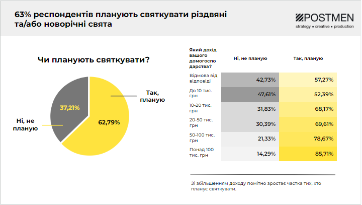 Як уточнили соціологи, бажання святкувати посилюється разом зі зростанням доходів родин, що закономірно. Більше половини українців-учасників опитування купують подарунки за два тижні до свят або й пізніше. Більшість планує дарувати солодощі і ділитися коштами на потреби армії та співгромадян (52,5% і 33,2%, відповідно).