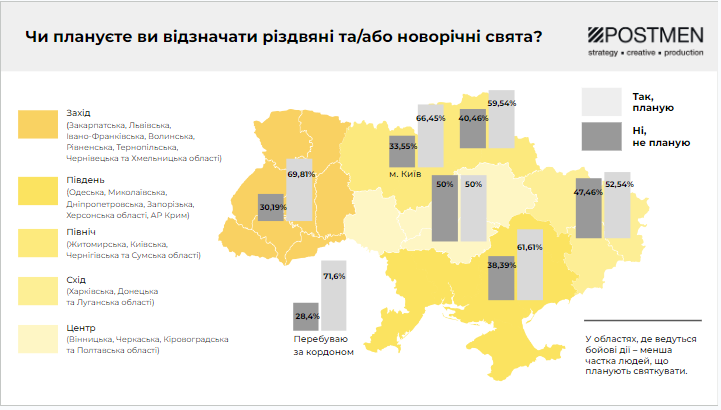 Зараз багато розмов на цю тему, і вони видаються доречними на тлі війни в Україні, яка й натяку не дає на закінчення. Тисячі людей скаржаться на відсутність відповідного настрою і небажання “йти в люди” на свята. Дарма, що психологи закликають святкувати зараз кожен момент життя. Щонайменше третина українців (37,2%) не відзначатимуть свята, як різдвяні, так і Новий рік та інші. Такі результати соціологічного дослідження від комунікативної агенції Postmen.