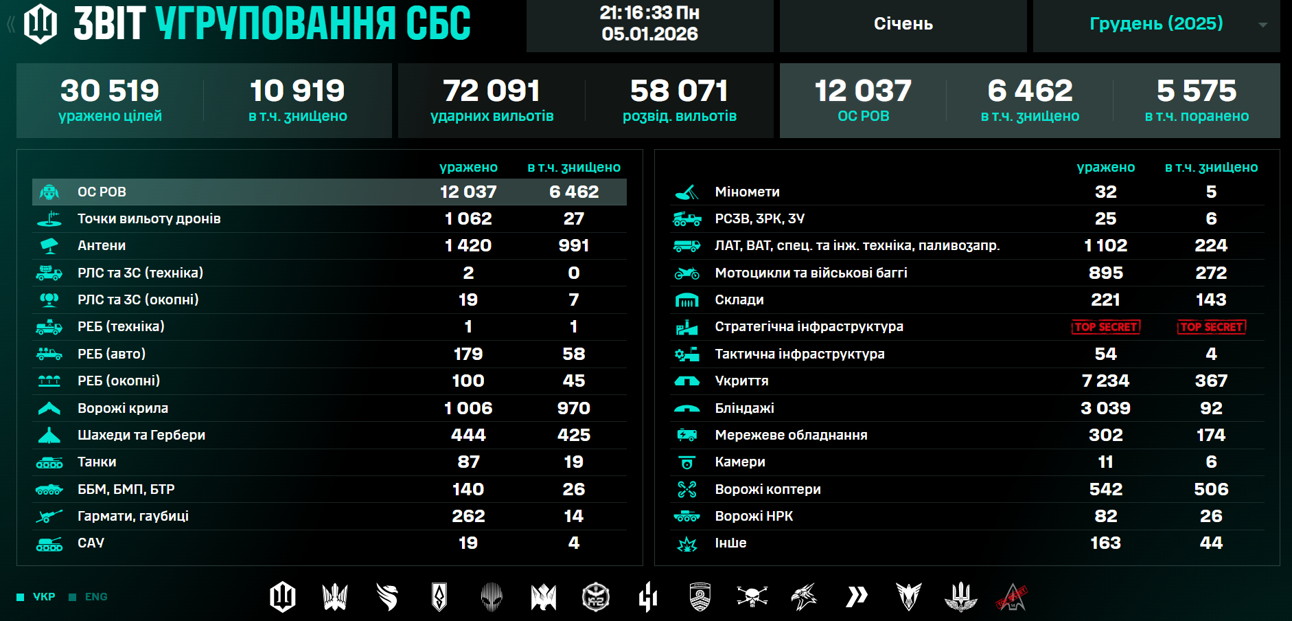Саме тому «Мадяр» додатково наводить окрему статистику СБС, де у грудні з 12 037 верифікованих уражень 6 462 віднесено до ліквідованих цілей, 5 575 — до поранених.
