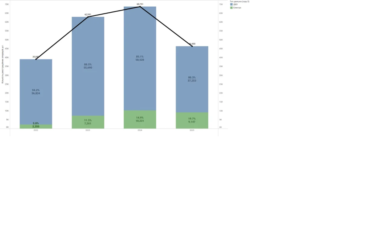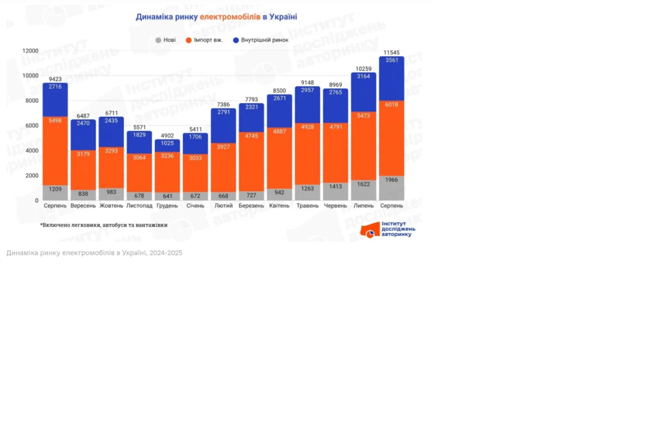 В загальному імпорті вживаних авто з 2022 року по 2025 роки електромобілі потіснили автомобілі з двигунами внутрішнього згорання, зменшивши їхню частку з 97,3% до 77,2%. В січні – серпні 2025 року було ввезено понад 37 тисяч вживаних BEV. І це становило 22,8% в загальній структурі імпорту.