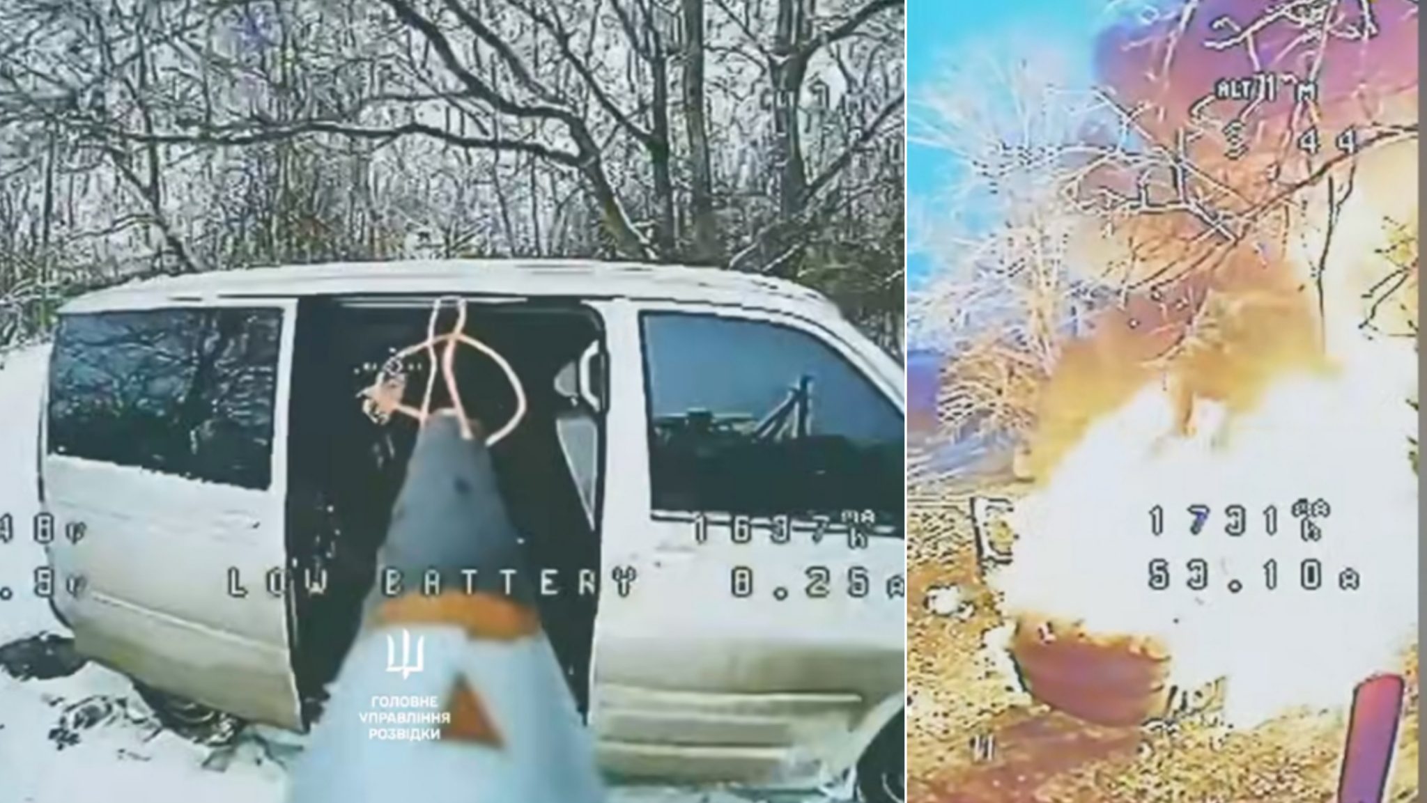 На кадрах видно, як перший дрон атакує автівку в яку заходить чоловік. А камера наступного дрона вже фіксує, як мікроавтобус горить.
