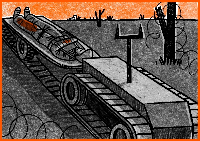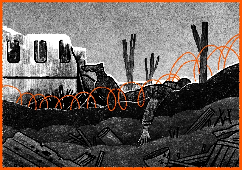 На різних ділянках фронту зона змішаних позицій і хаосу різна, і її межі постійно змінюються. Руїни, вирви від вибухів, згорілі машини й техніка, тіла, які не завжди вдається забрати — усе це ставить під сумнів будь-яку стабільність. Поле вкрите уламками, колючим дротом, оптоволоконними нитками від дронів і залишками військового спорядження. Цей хаос — водночас і укриття, і пастка.