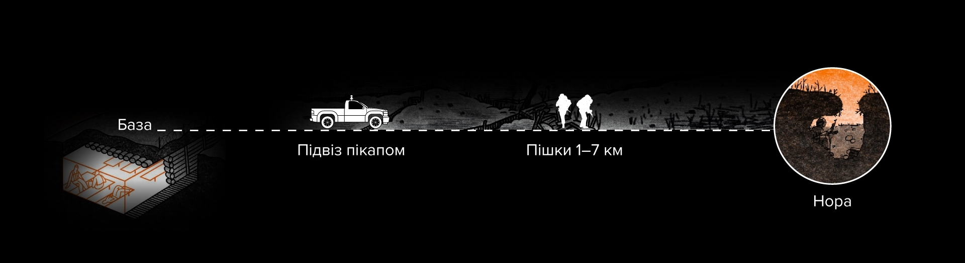 Ротація відбувається так: пікапи підвозять піхоту на відстань 1–7 км до нір. Далі люди йдуть пішки, несучи по 20–40 кг вантажу: боєприпаси, обмундирування, воду, їжу, індивідуальну РЕБ.