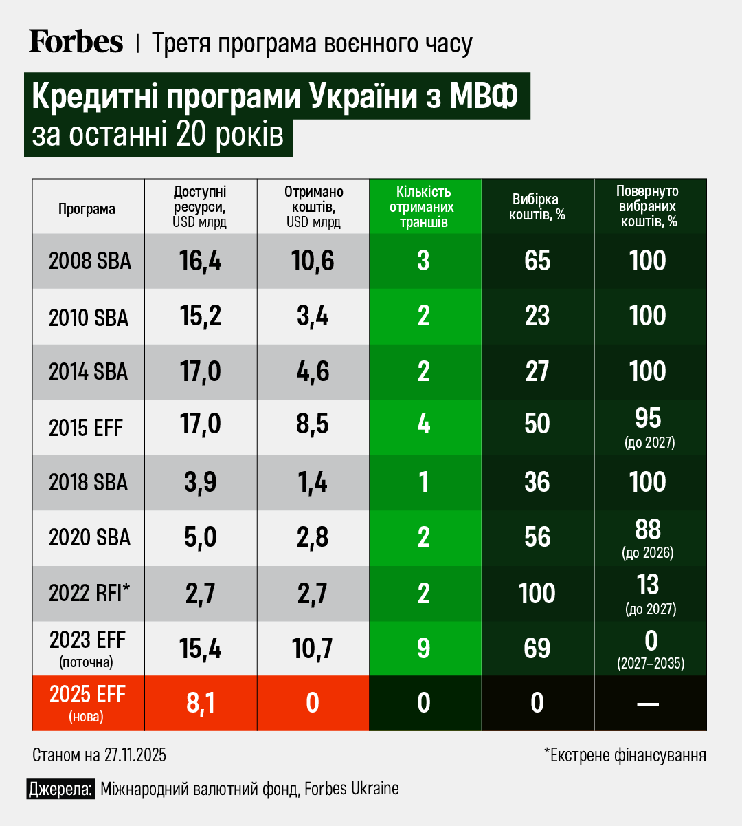 Додатковий парадокс: у 2026–2029 роках Україна має повернути МВФ близько $7,6 млрд за старими програмами (оцінка аналітичного відділу Forbes, на який ви посилаєтесь у вихідному тексті). Тобто нові $8,1 млрд майже повністю підуть на те, щоб погасити старі борги.