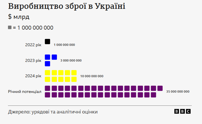 Якщо у перший рік повномасштабного російського вторгнення обсяг виробництва зброї в Україні становив приблизно 1 млрд доларів, то за минулий рік країна виробила зброї та військової техніки на майже 10 млрд доларів.