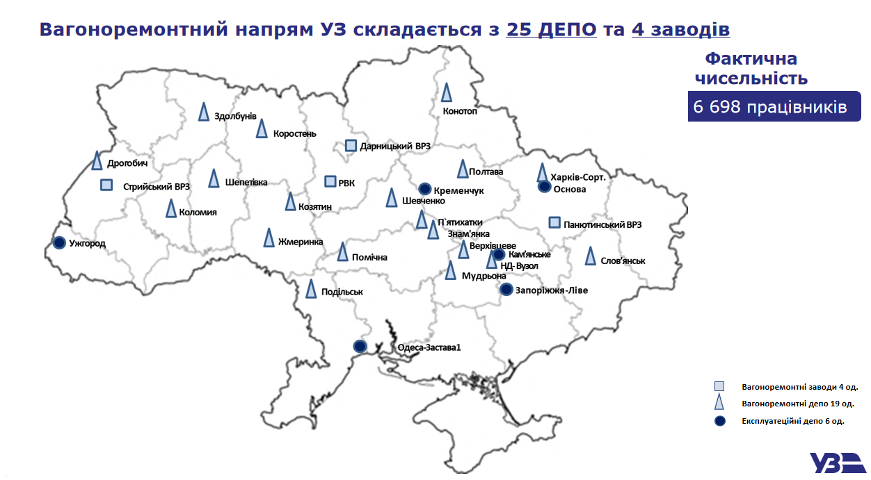 Через падіння перевезень під час війни обсяг ремонтних робіт на власних потужностях УЗ впав вдвічі. УЗ має 25 ДЕПО та чотири вагоноремонтні заводи: Дарницький (Київ), Стрийський (Львівщина), Панютинський (Харківщина) та «Рефрижераторна вагонна компанія» (Київщина).