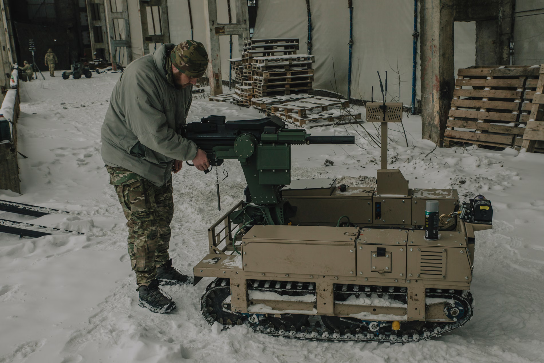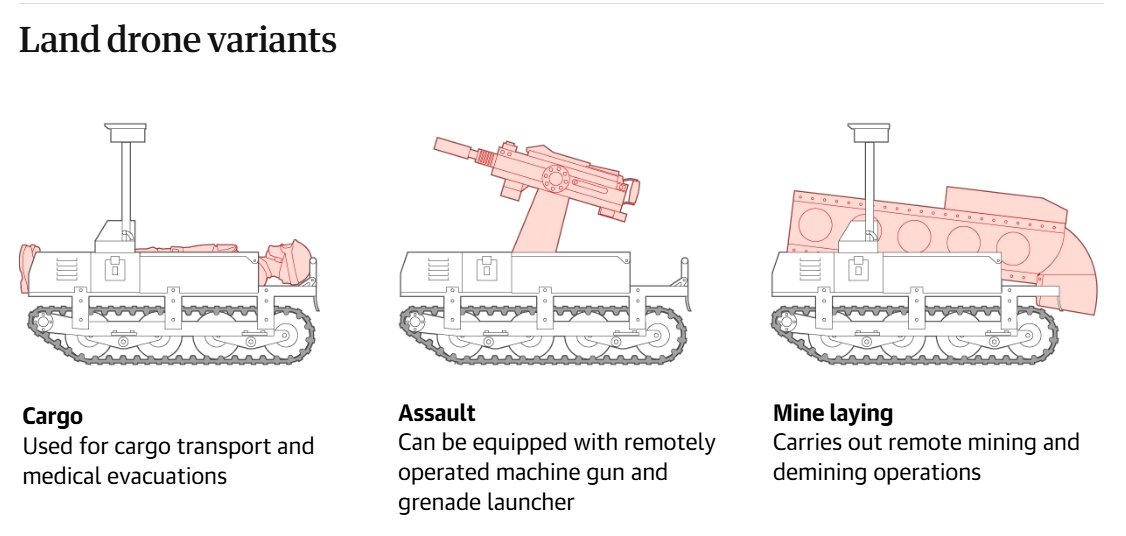 Окрема частина матеріалу присвячена тому, що наземні системи все частіше відіграють уже не допоміжну, а безпосередньо бойову роль. Їх оснащують кулеметами і гранатометами з дистанційним керуванням. Один із роботів, DevDroid TW 12.7, утримував позицію протягом 45 днів. Інший тип систем використовувався як робот-камікадзе з великою кількістю вибухівки.