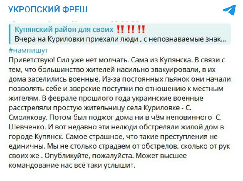 Наприклад, пропагандисти поширюють інформацію, нібито українські військові примусово евакуюють жителів Куп’янська з власних домівок і згодом заселяються в їхні оселі. Крім того, росіяни поширюють брехливі твердження, що через постійне пияцтво українські військовослужбовці вдаються до вбивств цивільних та обстрілів житлових будинків.