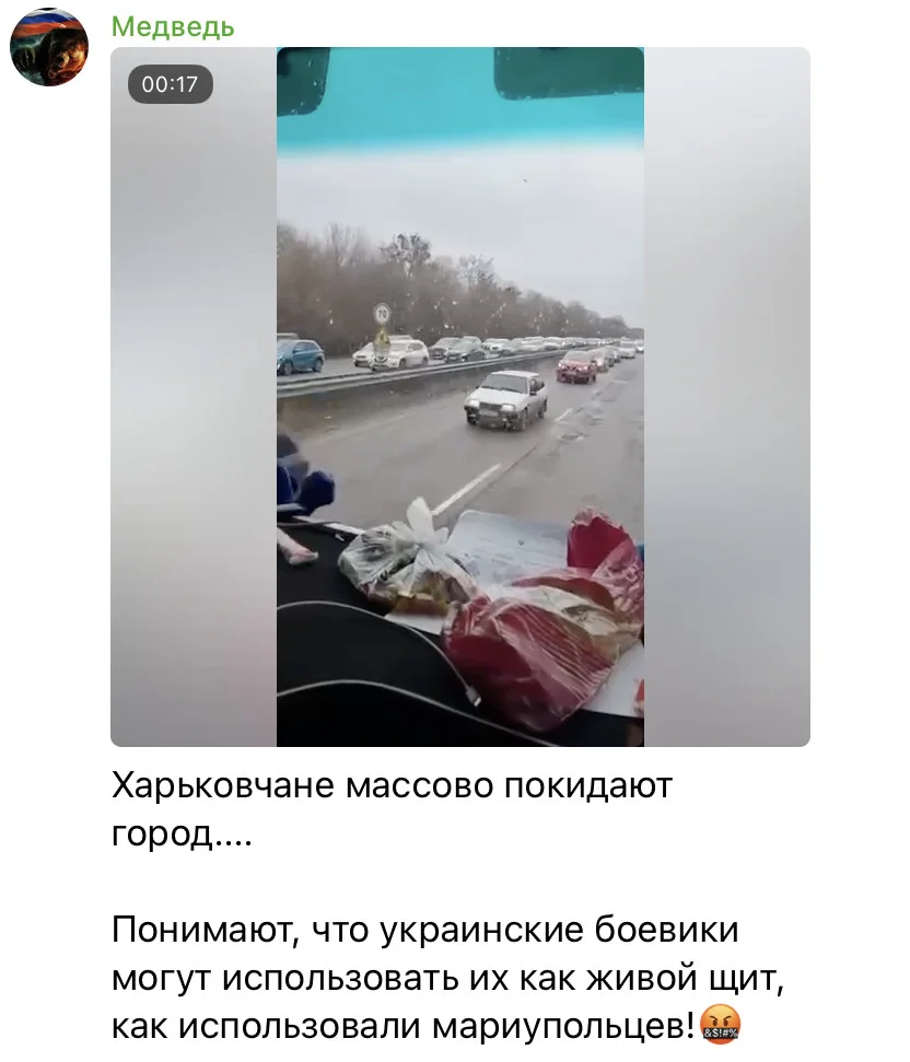 На відео можна побачити, як на виїзді з міста сформувався величезний затор — три смуги повністю забиті машинами, а у місто прямує тільки одна вантажівка, з якої й знятий відеоролик. Для потужнішого ефекту пропагандисти знову вдаються до аналогій з Маріуполем, мовляв, харків’яни виїжджають, бо розуміють, що ЗСУ під час нового наступу на місто використають їх, як і маріупольців, як «живий щит». Інші ж пропагандистські телеграм-канали заявляють, що реальною причиною є відсутність електроенергії, опалення та інших благ цивілізації у результаті російської ракетної атаки.