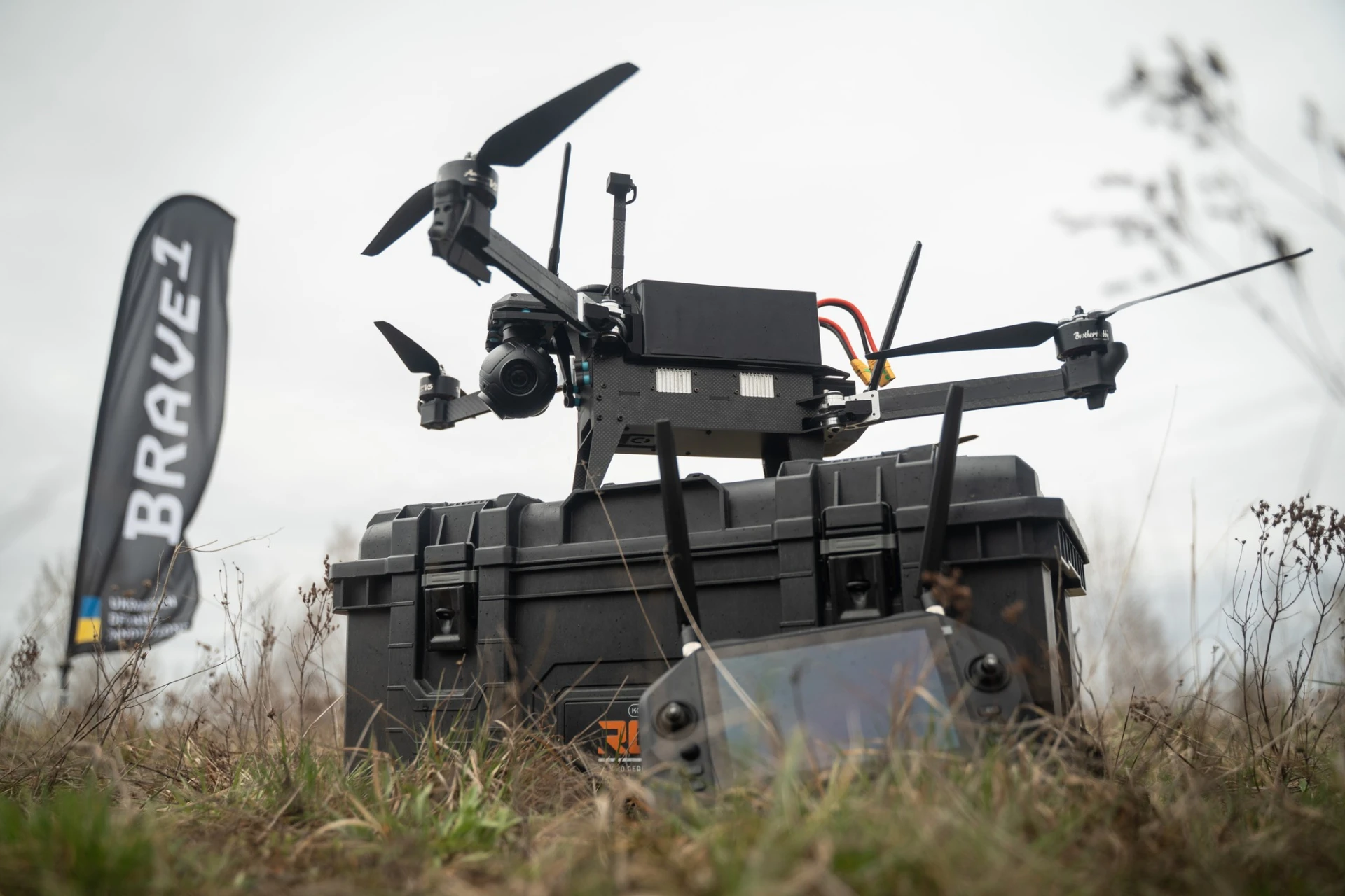 Український дрон квадрокоптерного типу під час випробувань на полігоні. Фото: Brave1