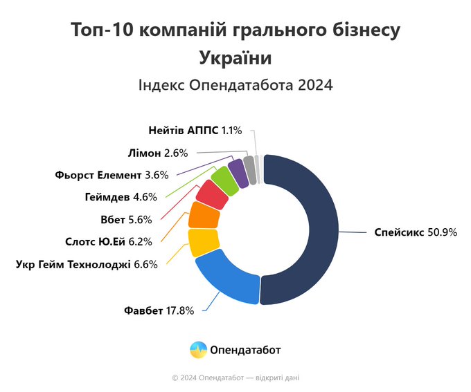 За даними Опендататбот, лідером сфери азартних ігор стала компанія Спейсікс (відома як Cosmolot). Її дохід у 2023 році перевищив показники попереднього року у 51 раз, досягнувши 27,95 млрд грн. На другому місці — компанія Фавбет (бренд FAVBET), дохід якої збільшився у 425 разів та склав 9,79 млрд грн. Це найбільший приріст серед усіх 10 найуспішніших компаній грального бізнесу.