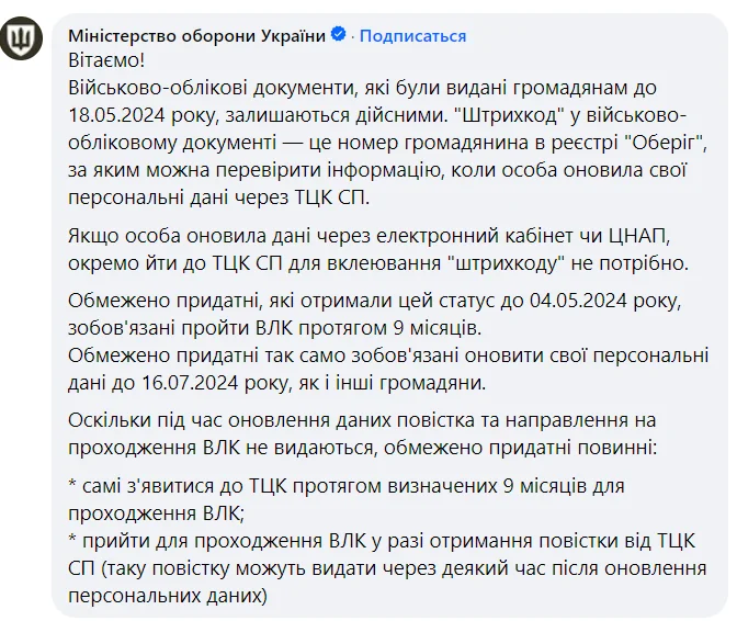«Військово-облікові документи, які були видані громадянам до 18 травня 2024 року, залишаються дійсними. „Штрихкод“ у військово-обліковому документі — це номер громадянина в реєстрі Оберіг, за яким можна перевірити інформацію, коли особа оновила свої персональні дані через ТЦК СП. Якщо особа оновила дані через електронний кабінет [Резерв+] чи ЦНАП, окремо йти до ТЦК СП для вклеювання „штрихкоду“ не потрібно», — йдеться у коментарі Міноборони під постом журналіста Сергія Сидоренка, який озвучив відповідне запитання.