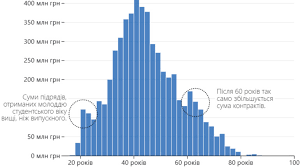 Такі історії настільки поширені, що їх можна побачити, якщо нанести на графік розподілу суми 28 тис. контрактів у березні-травні залежно від віку ФОПа-отримувача коштів. Неочікувані сплески будуть помітні в осіб студентського та пенсійного віку.
