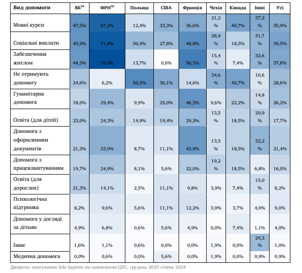 Найбільшою мірою зменшилася допомога біженцям у Польщі. У листопаді 2022 року лише 9,4% українців у цій країні повідомляли, що не отримують жодної допомоги. У січні 2024 року понад половина не отримує підтримки від польського уряду.