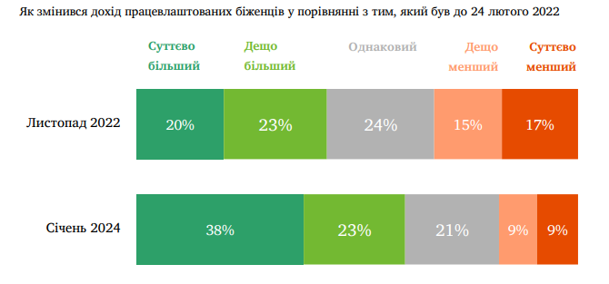 Серед працевлаштованих українських громадян за кордоном уже більшість повідомляє, що заробляє більше, ніж до повномасштабного вторгнення. Це майже на 20 відсоткових пунктів вище, ніж у листопаді 2022 року.