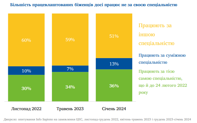 Приблизно половина серед працевлаштованих за кордоном українців працює не за тією спеціальністю, за якою працювала до великої війни. За понад рік ця частка дещо знизилася – з 60% до 51%. Натомість на 8 в. п. зросла частка тих, хто знайшов роботу за своєю або суміжною спеціальністю.