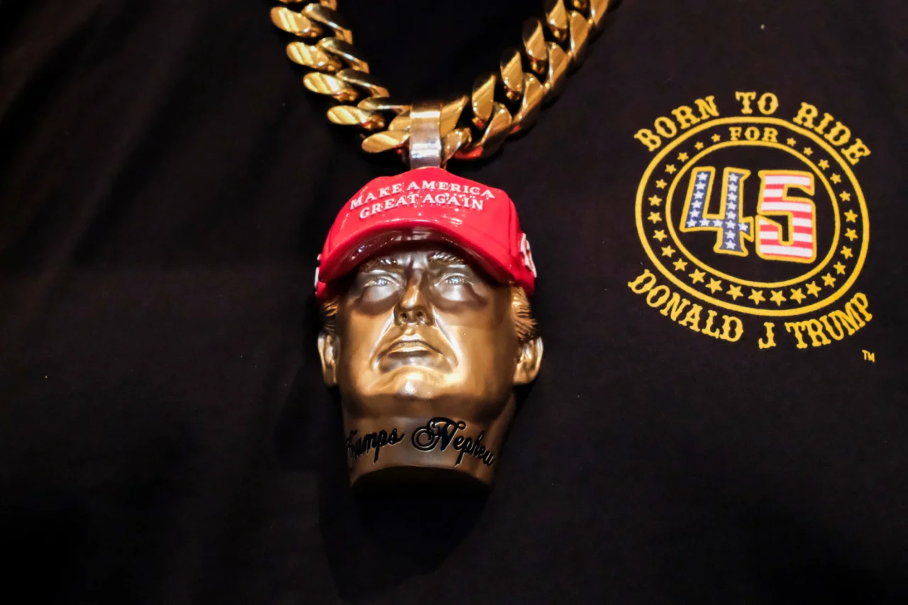 Репер Forgiato Blow (він же Kurt Jantz) демонструє кулон із зображенням Трампа на вечірці з нагоди святкування результатів Супервівторка у маєтку Дональта Трампа в Мар-а-Лаго, Палм-Біч, штат Флорида / Фото: REUTERS/Marco Bello