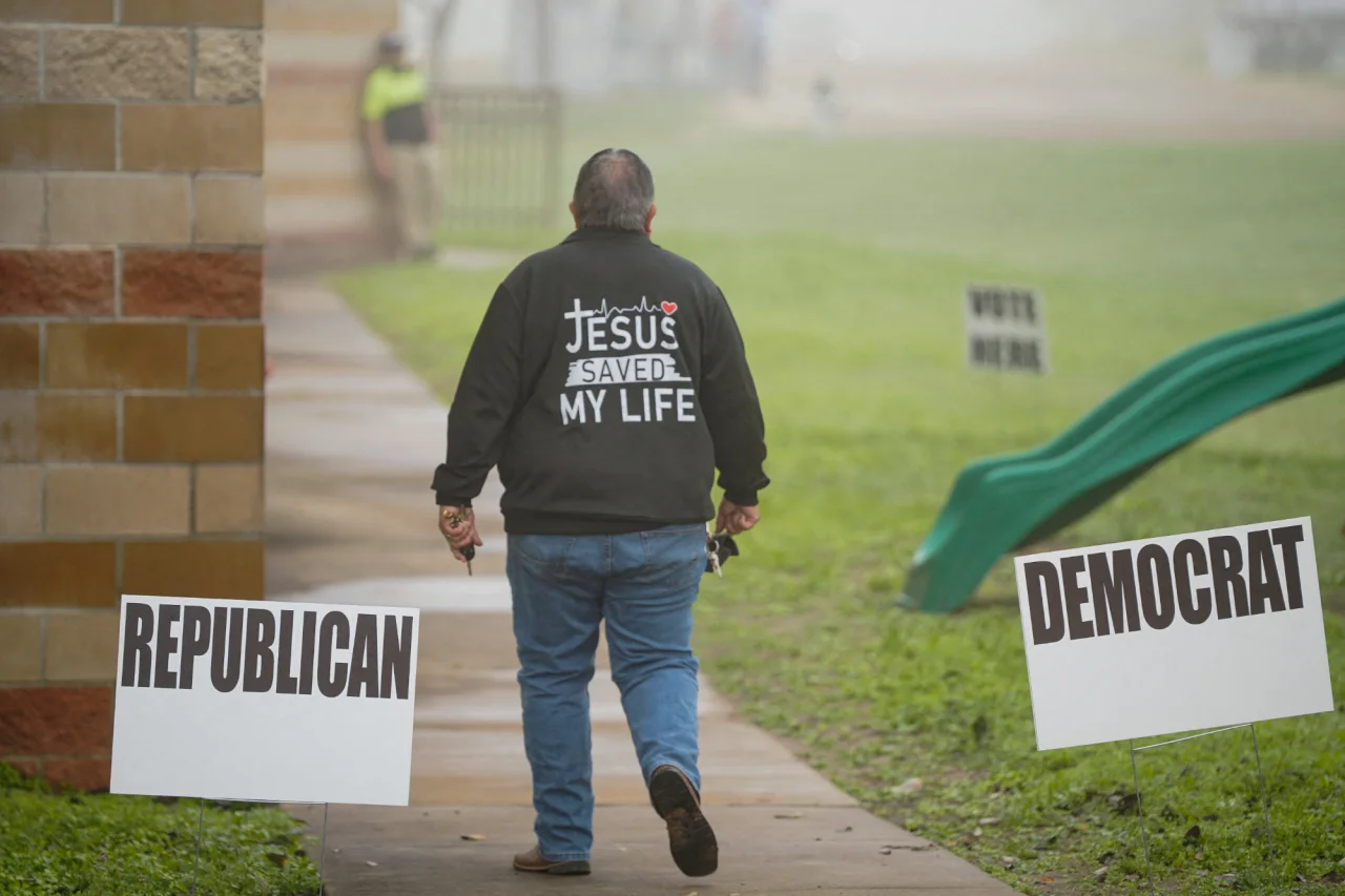 Виборець у місті Ріо-Гранде-Сіті, штат Техас (на його світшоті – напис “Ісус врятував моє життя”) / Фото: REUTERS/Cheney Orr